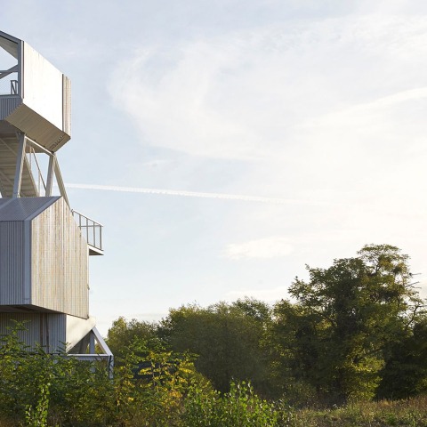 The visitor center, observatory and insect museum, designed jointly by the studios AWP and HHF, is located on the banks of the Seine River, in the village of Carrière-Sous-Poissy (France), near Le Corbusier's Ville Savoye. The center is materialized through a main building accompanied by small disaggregated "follies" that complement the program.