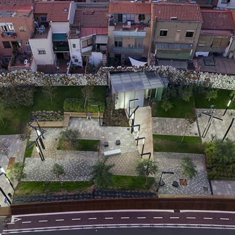 This intervention is located in one of the most built-up areas of Sant Feliu de Llobregat. A working class district that sprang up around the town’s former industrial fabric, encircling the textile factories that provided employment for the local residents who lived in modest housing huddled next to the factories. Following the demolition of one of the last remaining factories, an underground car park was built to serve the district known as ‘La Salut’, leaving a large void with a concrete cover on the site where the factory once stood.