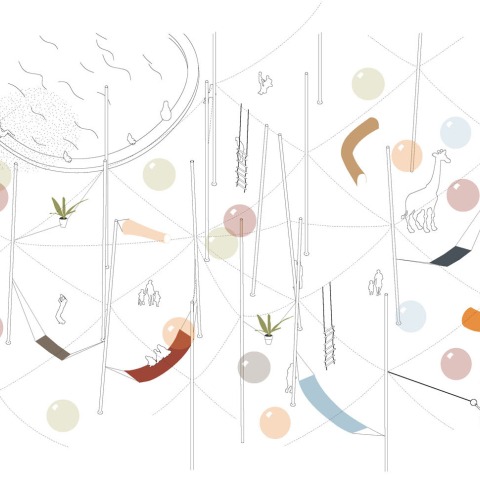 "We designed a participatory environment that reframes the conceptual relation between humankind and structure. It consists of an interconnected system of poles and nets whose equilibrium is constantly affected by human action and environmental factors, such as rain and wind. Upon discovery of its elasticity, visitors engage with the structure to invent games, test its limits or just watch it gently dance. We hope that such an environment re engages the public with the physical realm, triggering increased awareness and care for one’s direct environment."