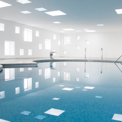 The main pool area is adorned with a series of square openings for windows in the roof that allow the light to flood into the area. The spa intended for skin treatments and relaxation is located to give the visitors the best views of the surrounding landscape and is also filled with light in all rooms where light is needed.