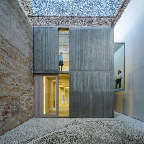It is a compact concrete construction of two floors height, an unique cradle and constant section that allows the interior connection with the adjacent building and opens - by the south - to a great inner courtyard, where a garden meadow and a vertical bower which is similar to the one in the facade, tempering the chaotic image of walls and facades that envelop it, at the same time as a new urban public space block, the lung of the whole set.