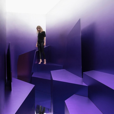 The monochromatic pavilion has purple gradient background, where dark purple fades slowly into light purple thus creating a three-dimensional perception of the space. Maxim decided to work with only one colour to strengthen the perception of abstract space and focus visitor’s attention on it only. Geometrical shapes used in the pavilion are mainly triangles and rectangles and are placed on different levels to create volume, emphasising the effect of colour gradient and let the visitors interact with the space - sit and walk around. The floor is a mirrored surface to enlarge the space. Gross built area of the project is 16 square meters.