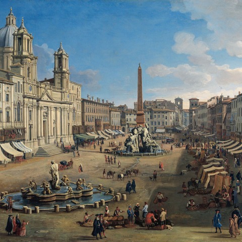 Piazza Navona. GASPAR VAN WITTEL. Oil on canvas, 96,5 x 216 cm. 1699. Madrid, Carmen Thyssen-Bornemisza Collection on deposit at the Museo Nacional Thyssen-Bornemisza.