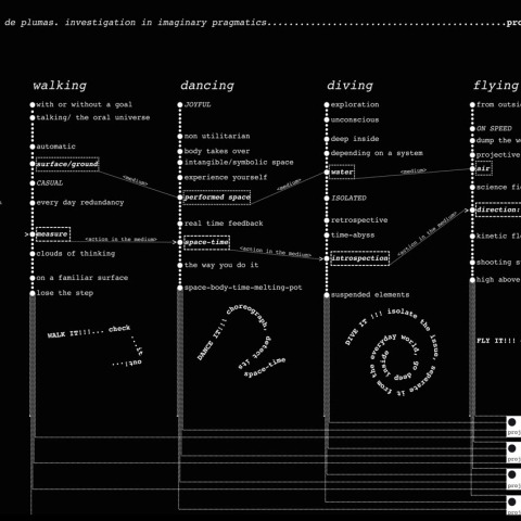 "Pez de plumas [featherfish] is a continuous field travel devoted to the extended frame of architecture and urbanism. It moves throughdifferent settings related to research and exploration. That travel is based on the productive ambiguity embodied by the featherfish, being an excellent walker, dancer, diver and flyer at once. Its numerous adventures challenge and drive all that is conceived, said, written, drawn and implemented in our discipline.
