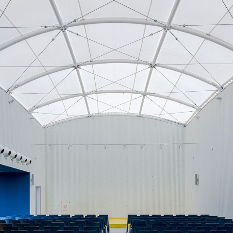 From the main courtyard, the visitor moves towards the most open area of the house and the intervention typologically moves away from it, adapting to the free space where, effectively, there is no previous materiality which can be used. In this way, the volume dedicated to the auditorium is formed as the most significant element of this part of the intervention. It is conceived as a capsule which is built with a network of arches, a tensioned textile membrane cover and cladding of sheet metal panels as vertical cloths. The access is made through a gallery that comes from reception followed by a small lobby which expands the entrance space. This installation is equipped with a dressing room module connected in turn with both reception and the auditorium. Taking into account that its capacity is close to 200 people and that the platform on which it is available is horizontal, a delimitation for a minimum elevation scenario is proposed with the idea of presenting it almost as a television set, where the representation and the public are closed together and connected. The experience of using this space is completed with an actionable side wall that, once uploaded, allows visitors to observe the remains of the oil mill that was in the house and also the use of the enclosure as an outdoor space. At night, this image is enhanced with the use of RGB LED spotlights which are projected on the whitewashed walls.