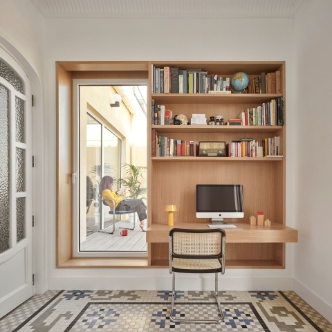 In relation to updating the house to a current way of life, they used a new material, wood, that gives shape to all the elements of the interior distribution and thus create a continuity between the different spaces.