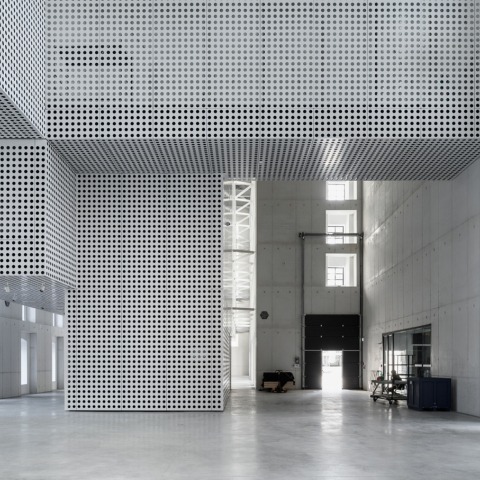 The perforated skin is an aesthetic device, visibly marking the new volumes – but also a functional element. It is an acoustic dampener, reducing reverberation, which makes it possible to hold concerts in the main hall; it is also a lighting fixture, and an HVAC distribution system.