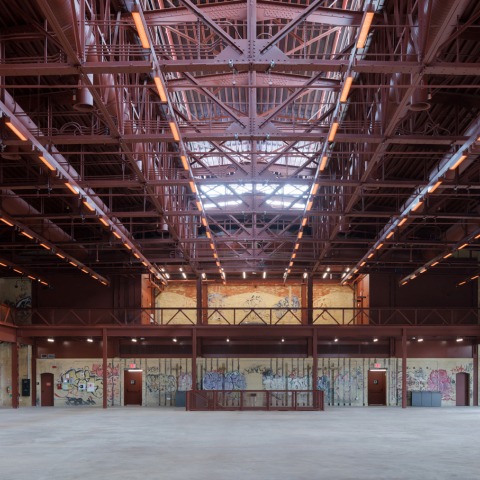 The design by Herzog & de Meuron renovates the historic boiler room, and the exposed concrete structure provides flexible workshop spaces that are vertically stacked. The turbine room preserves the traces and remains of its different occupants integrated into the new project. On the upper floor, the project has exposed the metal structure and trusses, offering a large open space for different types of events, and exhibitions.