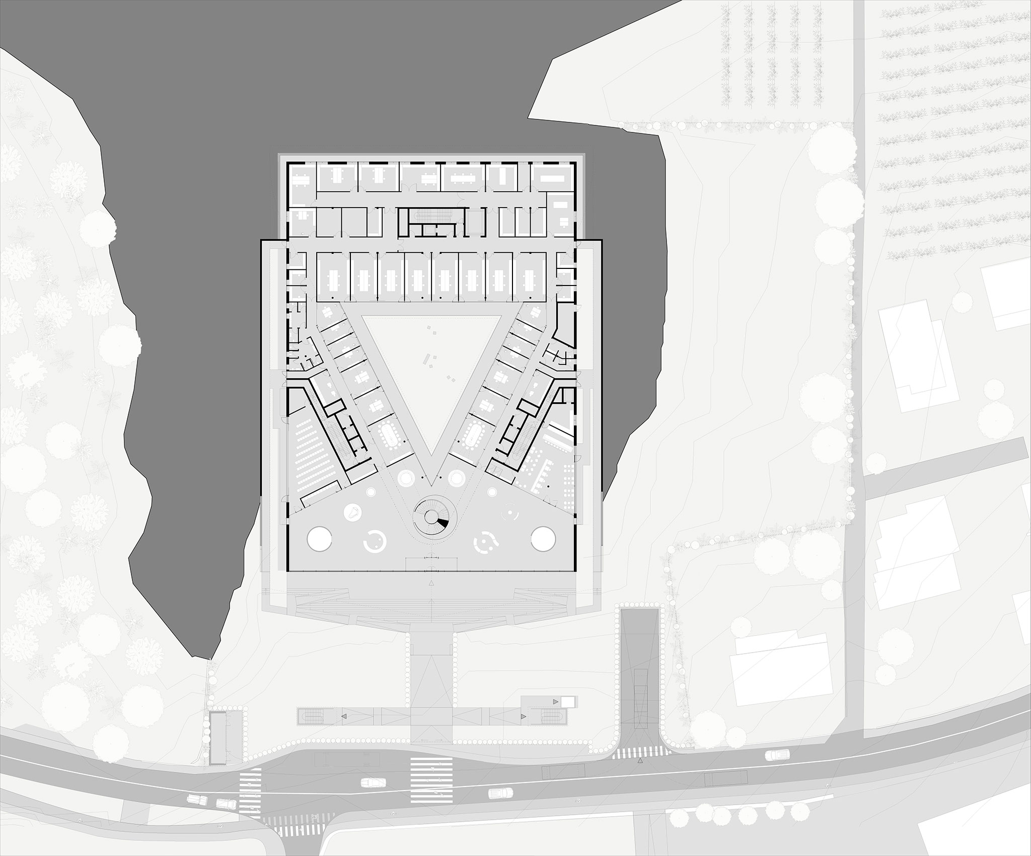 The main entrance is accessible from the street and across the plaza, while both visitors and employees can also access the building directly via the underground parking. Upon entering the main foyer, visitors are welcomed by a sculptural spiral staircase that connects the underground exhibition area with the ground and first floor.