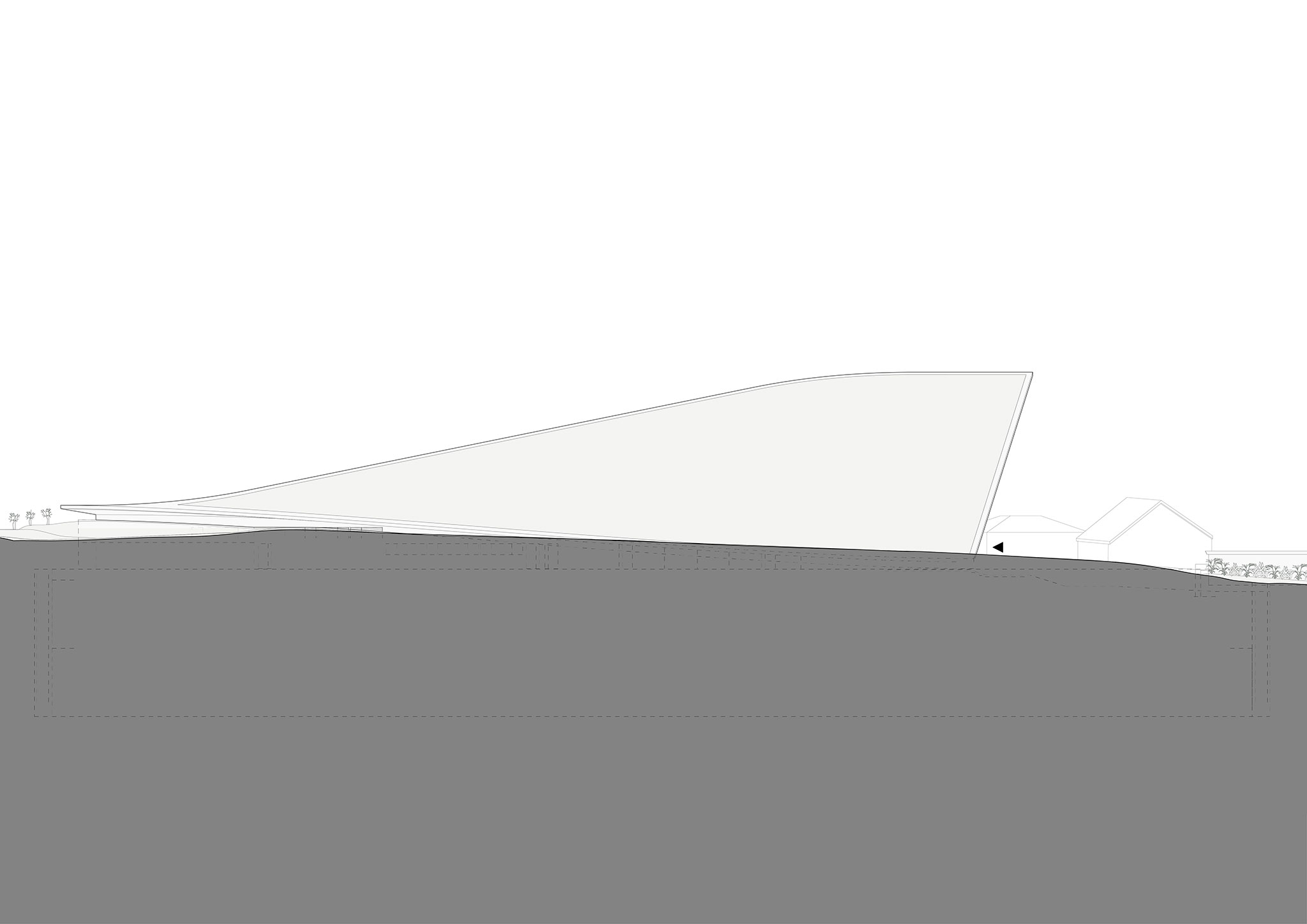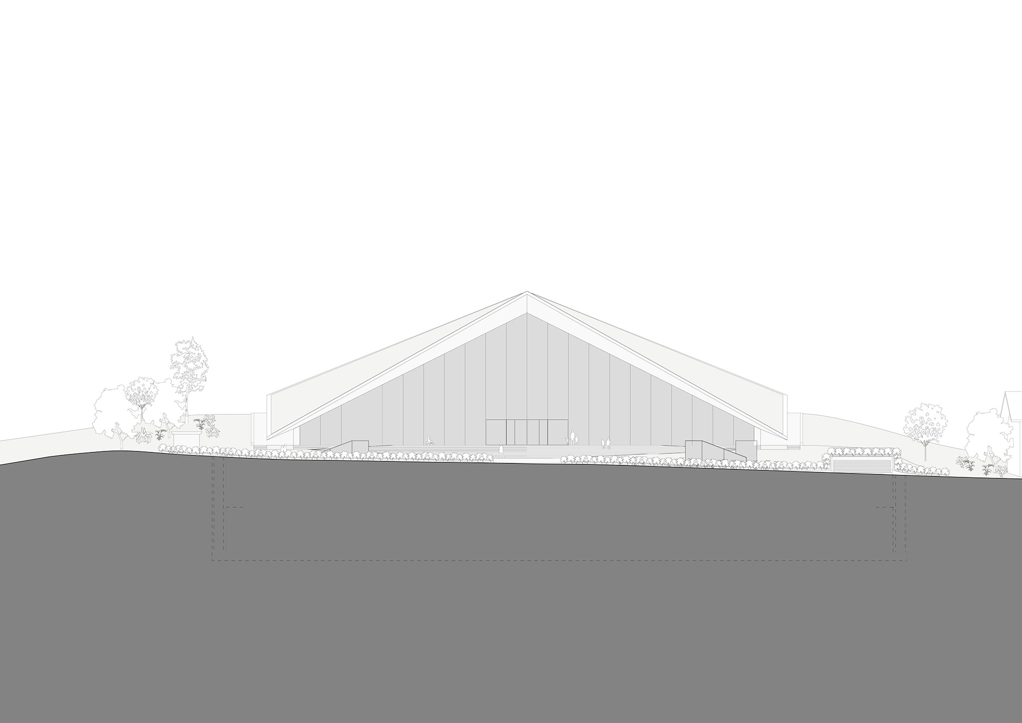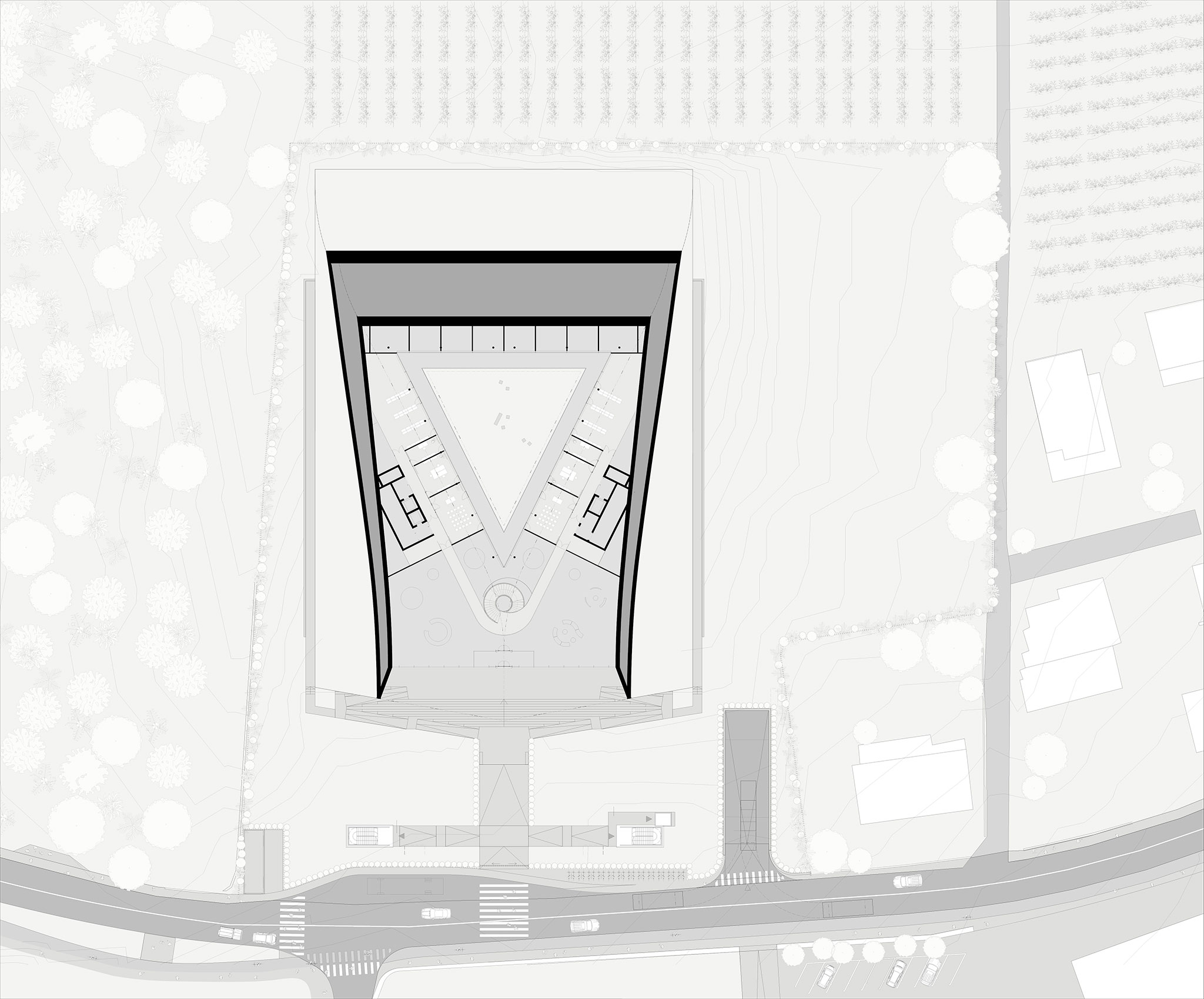 The design is partially integrated into the site, respecting its relationship with the surrounding context through a green roof that becomes an extension of the landscape. The building offers dual access for all users, one from the street and another from the underground parking garage. Upon entering, a sculptural spiral staircase connects the underground exhibition area to the ground floor and first floor.