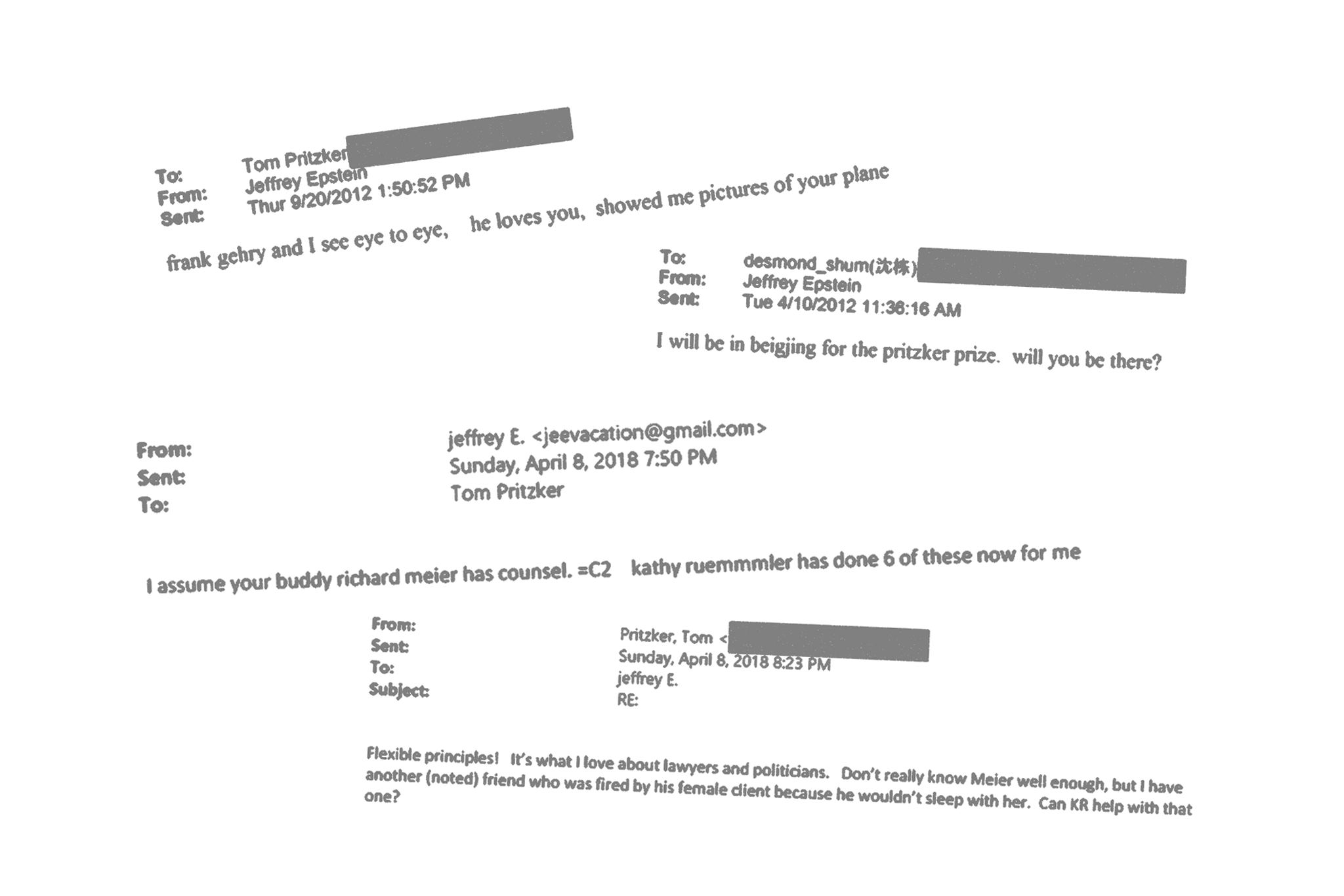 Following the January 30 release by the U.S. Department of Justice (DOJ) of more than three million emails related to Epstein, various U.S. media outlets uncovered documents and references to patrons among the case’s emails (a detailed account of the messages, which reveal Tom Pritzker’s relationship with Jeffrey Epstein, was published in The Architect’s Newspaper). In addition to Tom Pritzker, the correspondence also mentioned Gensler and prominent architects such as Richard Meier, Frank Gehry, Neri Oxman, Peter Marino, Renzo Piano, Joi Ito, Philippe Van Den Broek, and Kevin Ouvre. The documents left many questions regarding how those involved would respond, since mere inclusion in the papers did not, in itself, imply any wrongdoing.