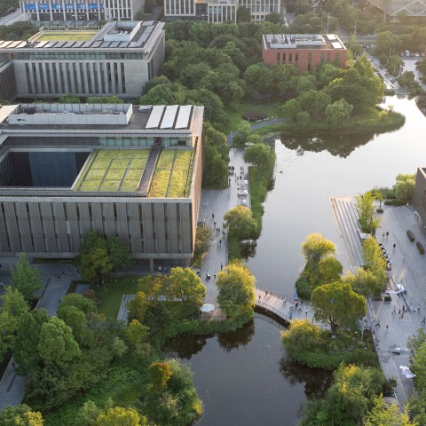 Located in Hangzhou, eastern China, the R&D Park provides Huawei, one of the world’s leading manufacturers of mobile communication devices, with ample space for research and development. Embedded in a lush waterscape, the 251,000-square-meter site located in the northwestern part of the city features offices, administrative buildings, and a canteen for 8,000 employees. The Knowledge Park and the Landscape Park merge into a harmonious whole.