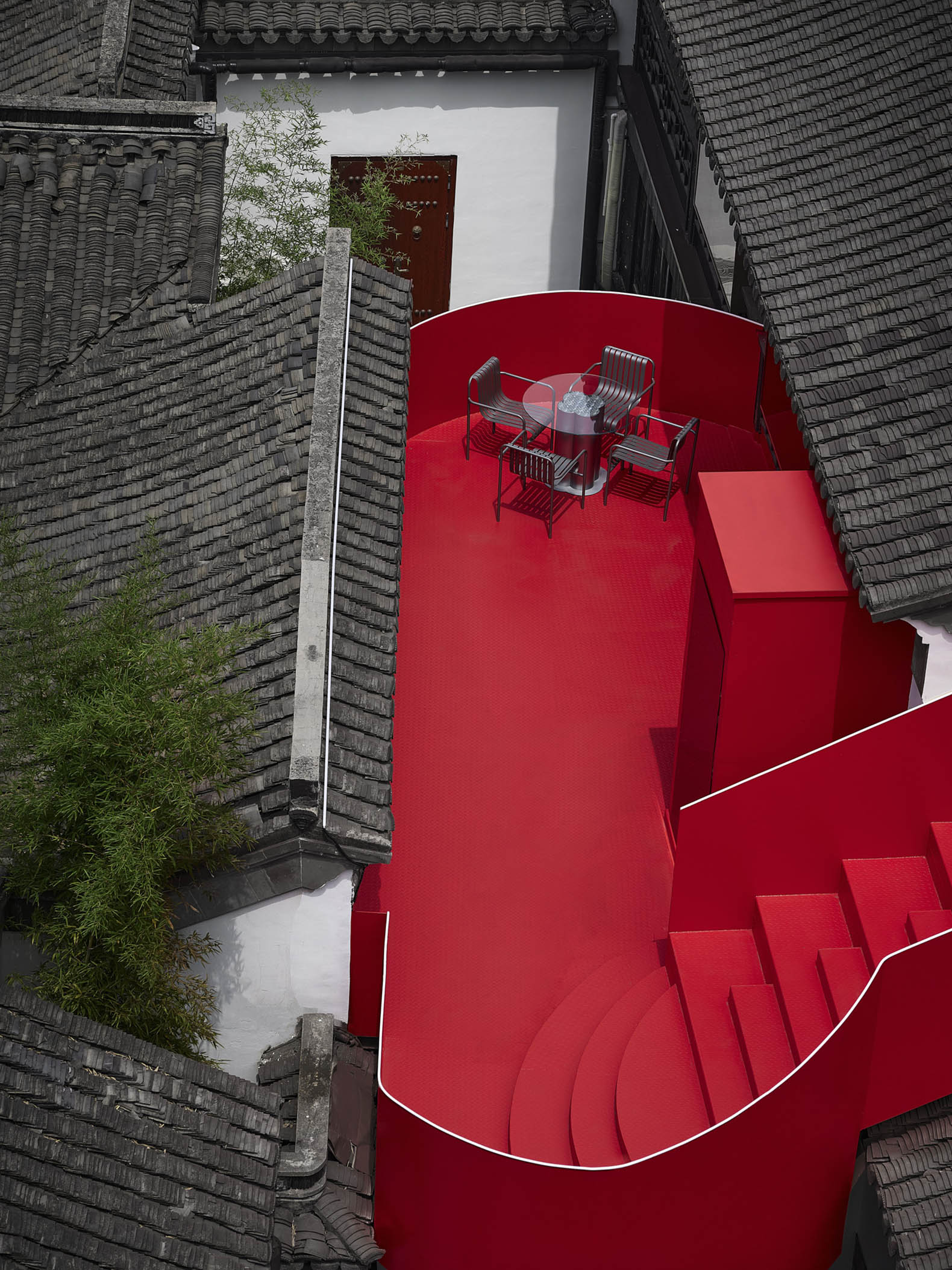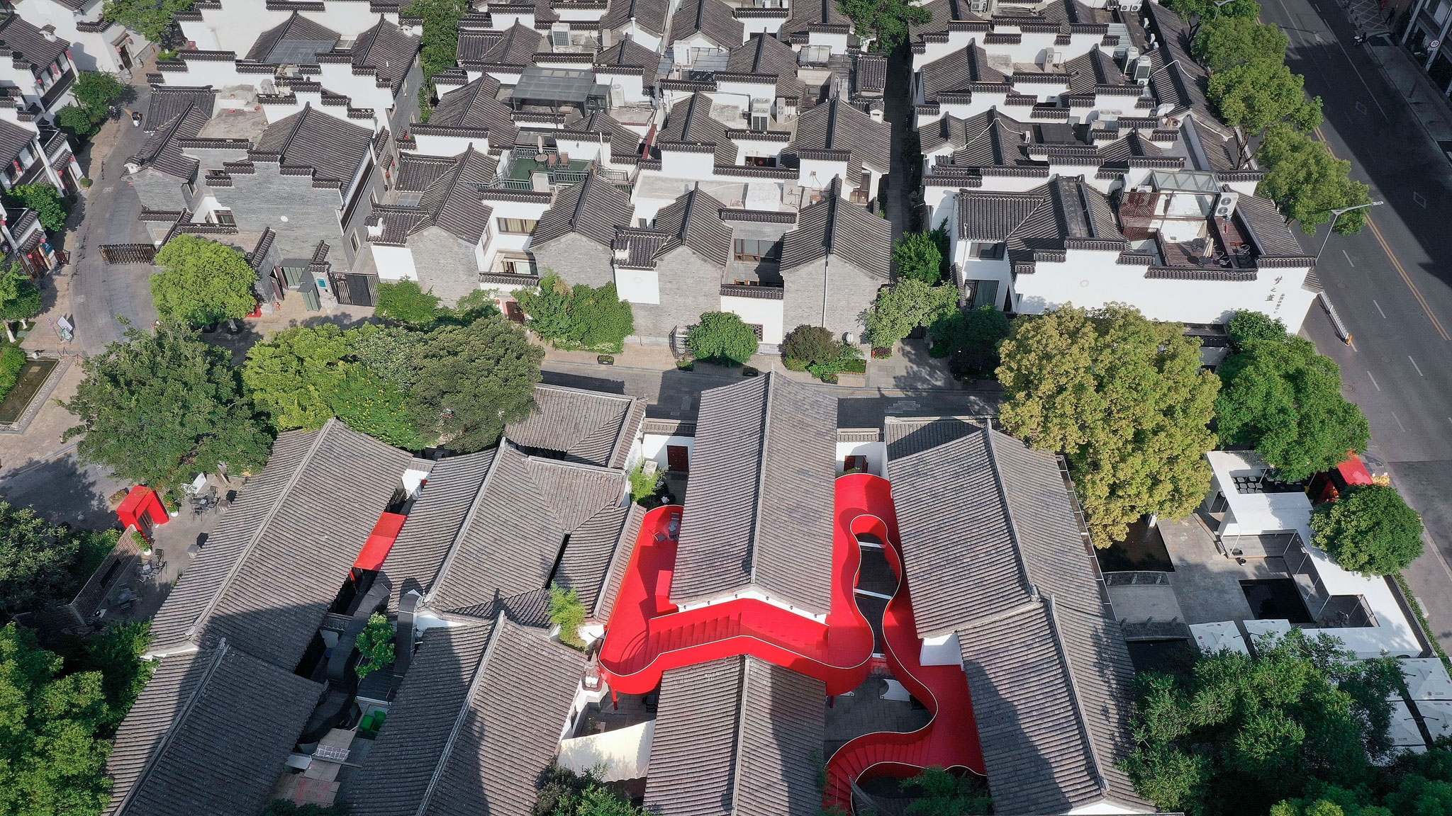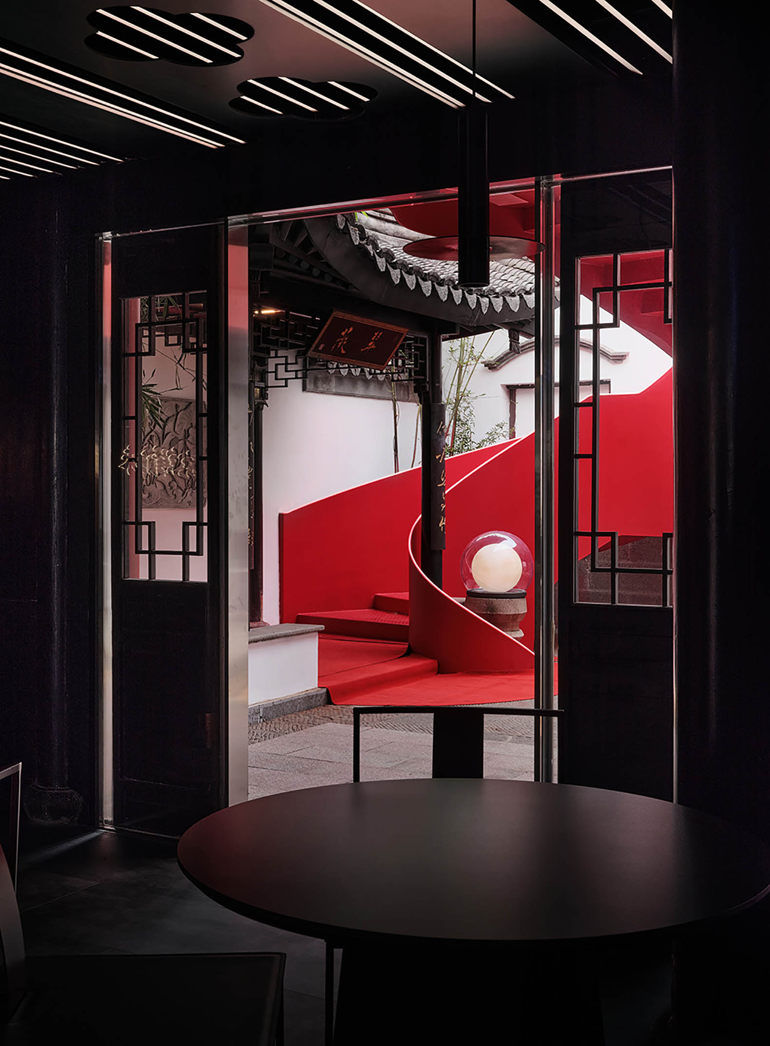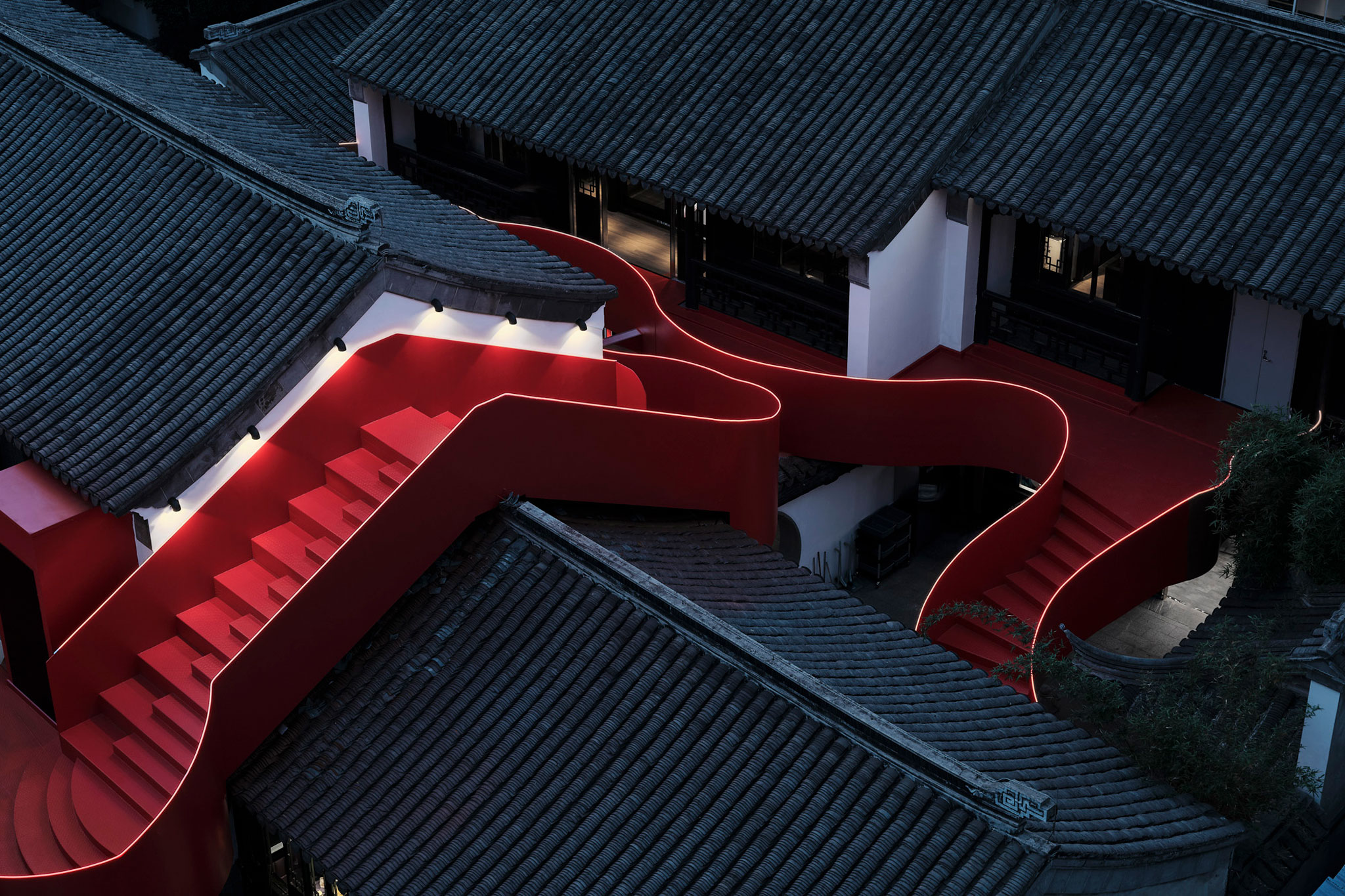 Zhou Yi designed a series of steel walkways and staircases at different levels, their continuity between four buildings symbolizing a protective dragon. The project repurposes a 300-year-old former residence of Xie An, an official of the Eastern Jin dynasty, integrating it into contemporary use while preserving its historical value. The visual image, its dynamic energy, and the color red connect with the project's theme of "Big Red Crayfish," creating an immersive gastronomic experience.