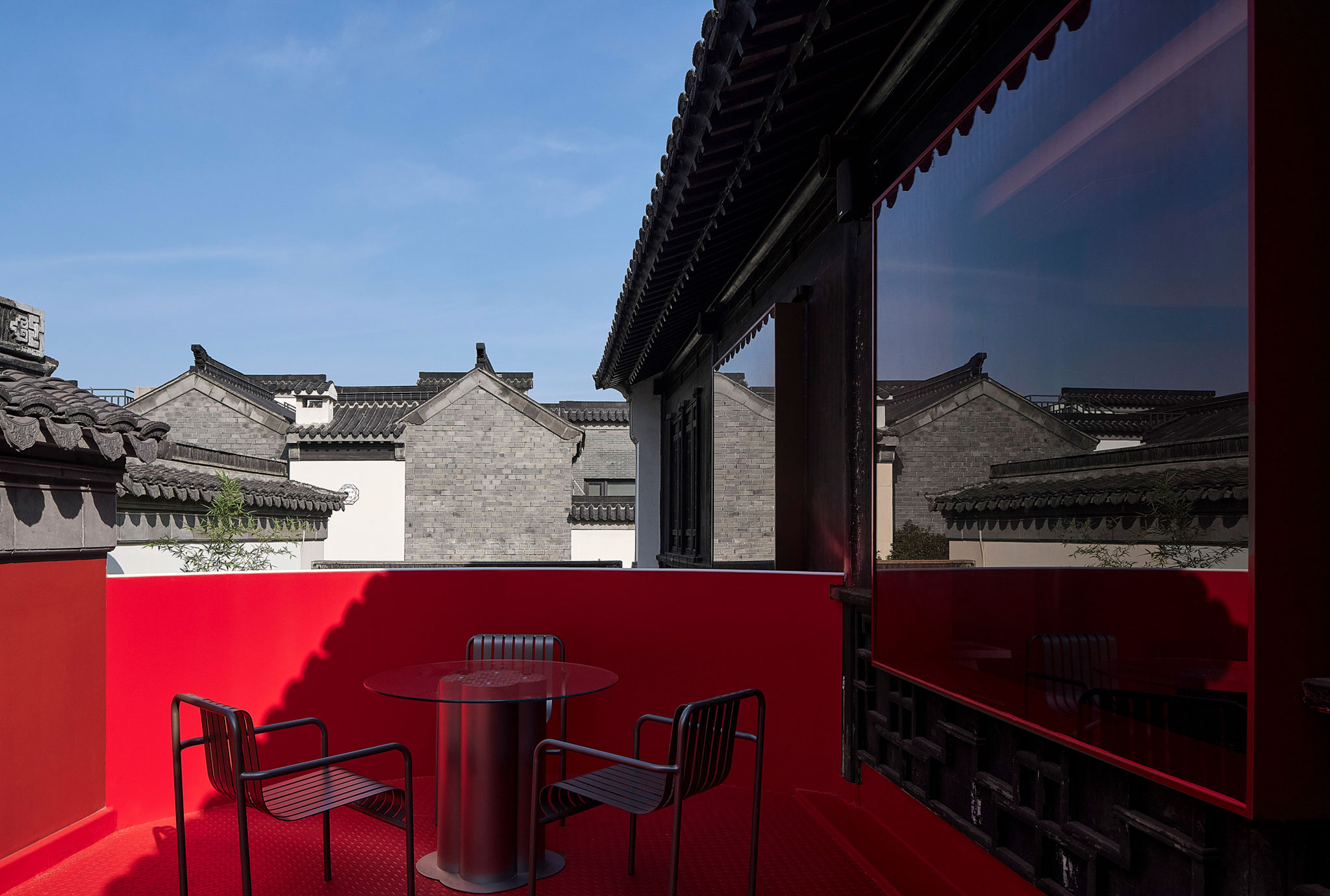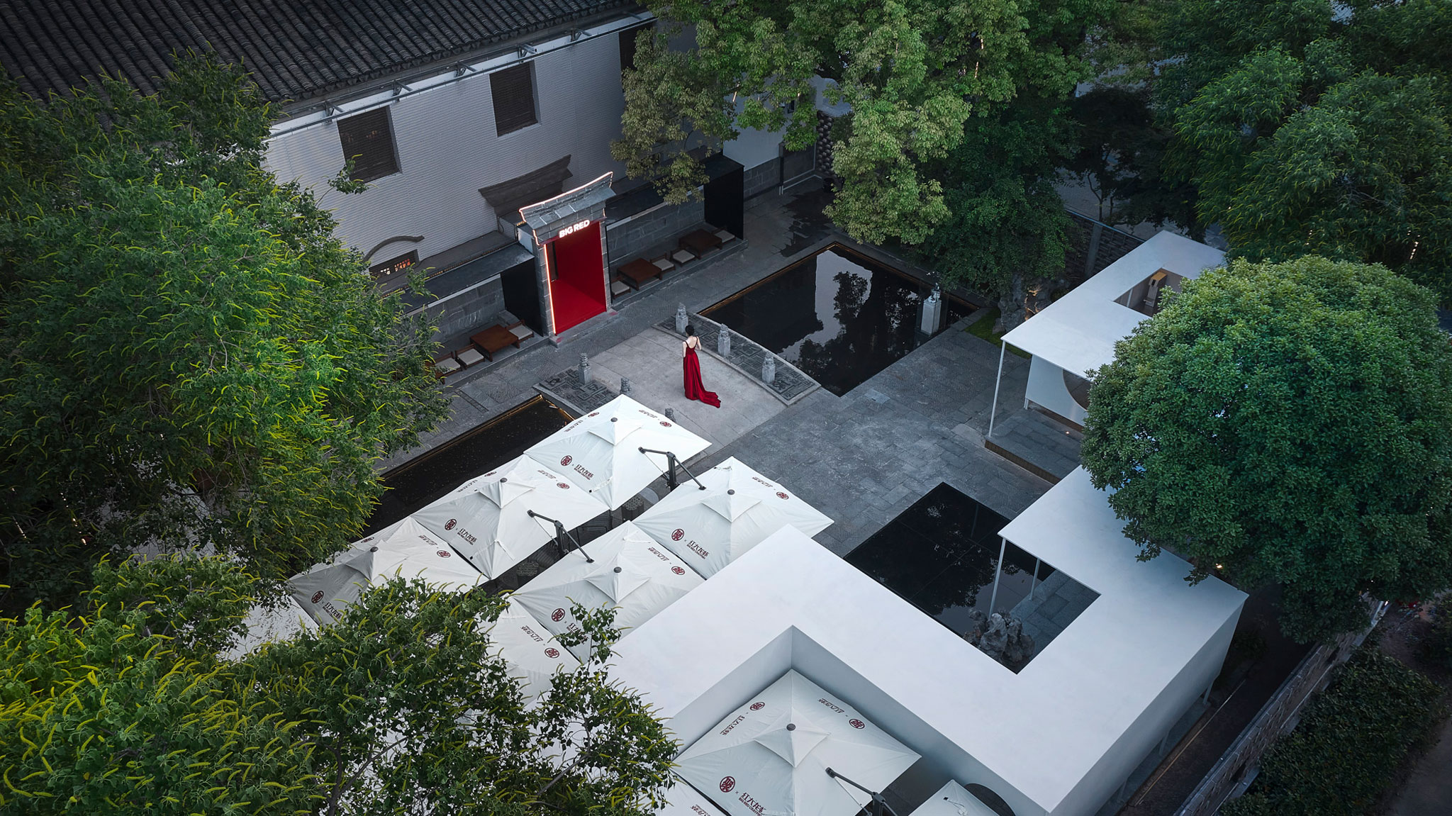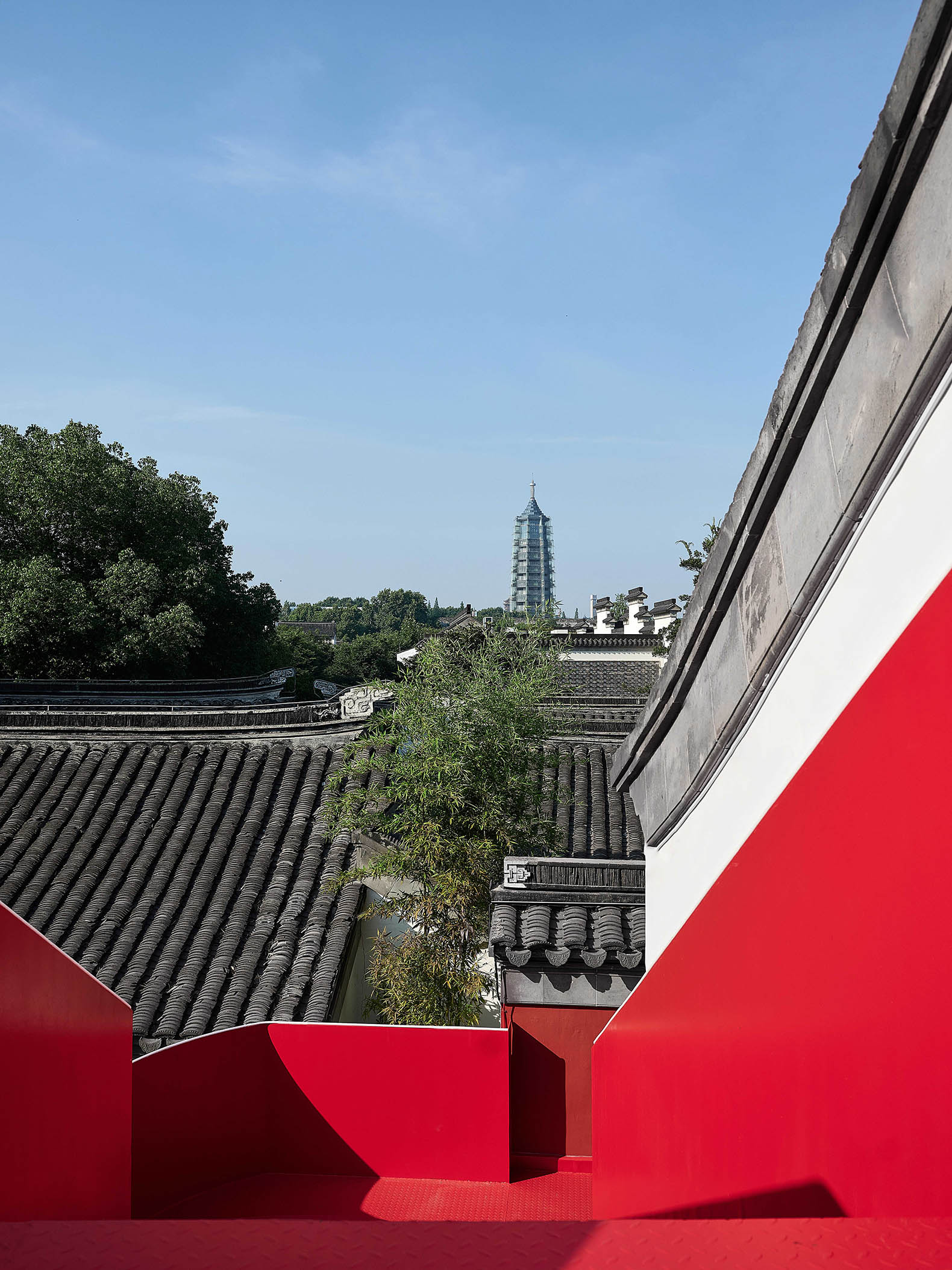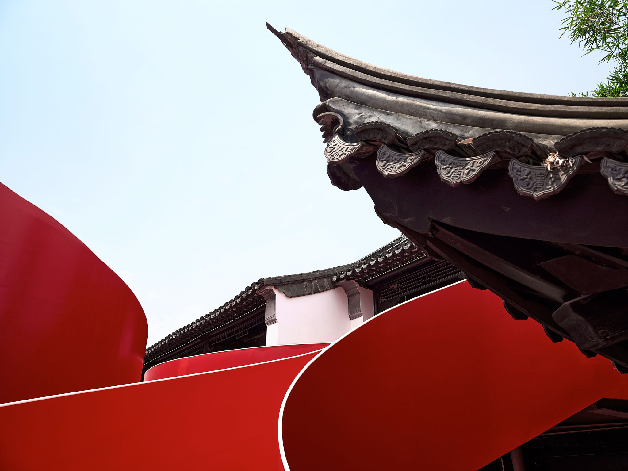 Zhou Yi designed a series of steel walkways and staircases at different levels, their continuity between four buildings symbolizing a protective dragon. The project repurposes a 300-year-old former residence of Xie An, an official of the Eastern Jin dynasty, integrating it into contemporary use while preserving its historical value. The visual image, its dynamic energy, and the color red connect with the project's theme of "Big Red Crayfish," creating an immersive gastronomic experience.