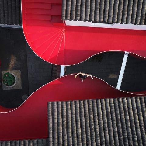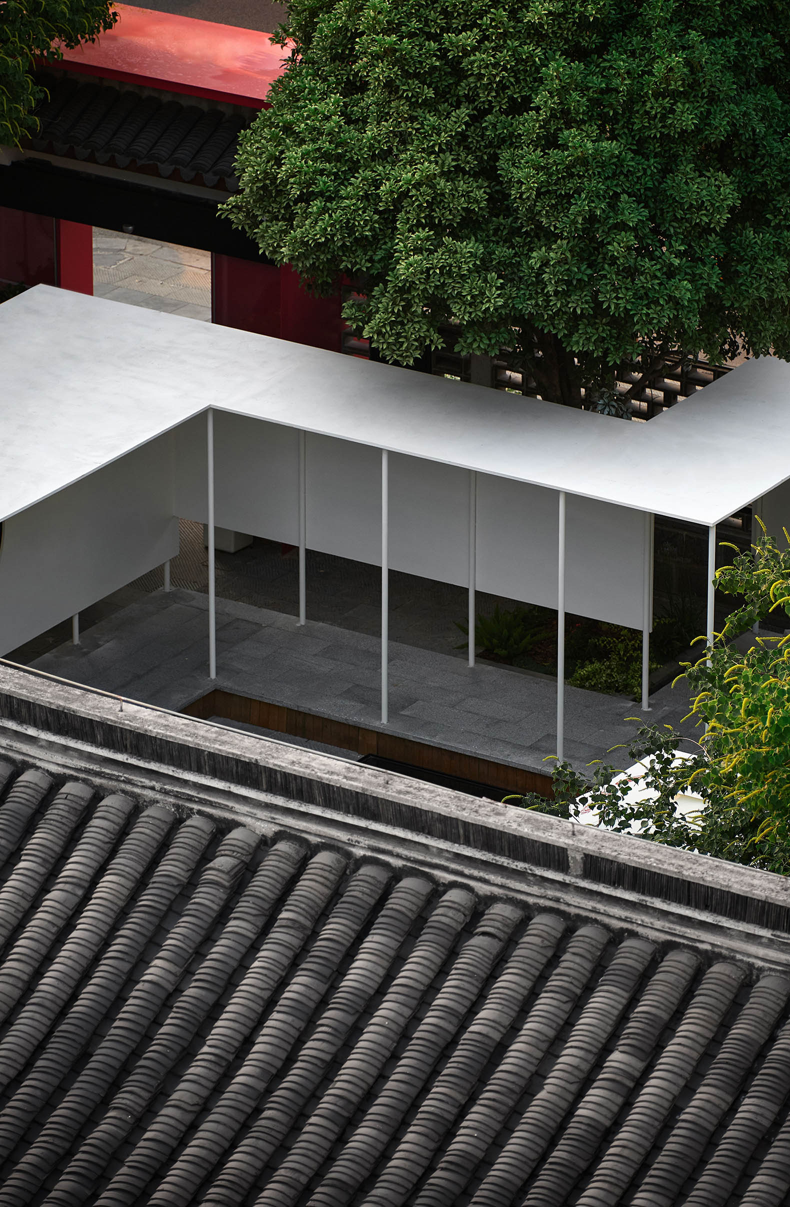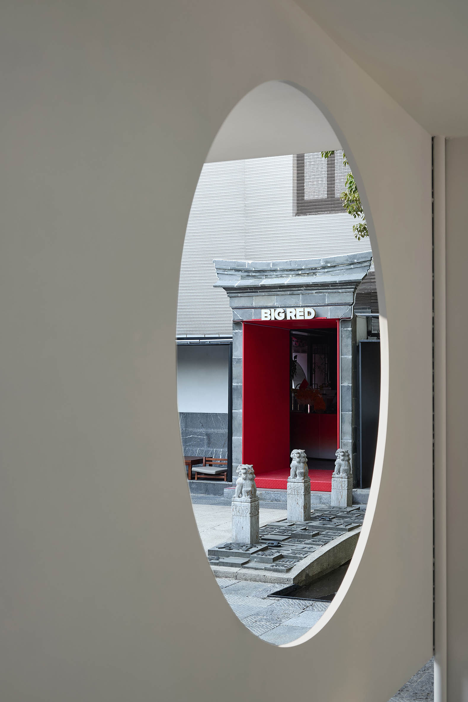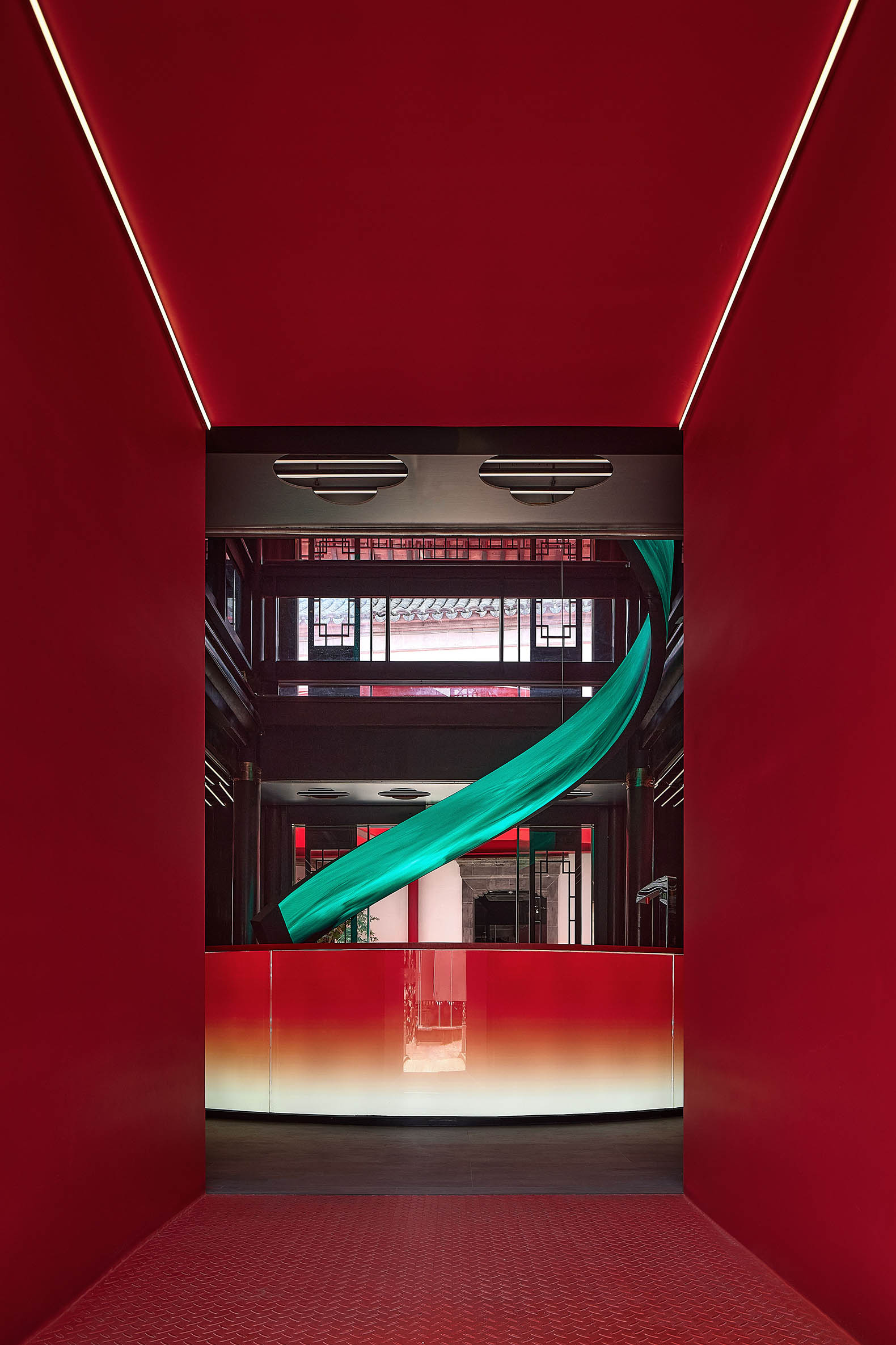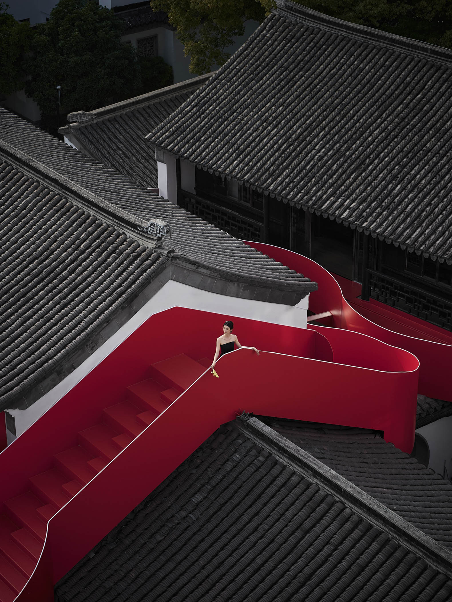 Zhou Yi designed a series of steel walkways and staircases at different levels, their continuity between four buildings symbolizing a protective dragon. The project repurposes a 300-year-old former residence of Xie An, an official of the Eastern Jin dynasty, integrating it into contemporary use while preserving its historical value. The visual image, its dynamic energy, and the color red connect with the project's theme of "Big Red Crayfish," creating an immersive gastronomic experience.