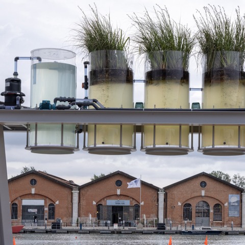 The award went to Canal Café, a project created by Diller Scofidio + Renfro, teaming with Natural Systems Utilities, SODAI, Aaron Betsky, and Davide Oldani. The installation uses natural filtration systems to purify water from the city's canals and transform it into a coffee that Arsenal visitors can enjoy.