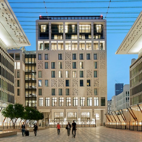 The colonnades, a traditional feature of Qatari architecture, form thresholds between streets and buildings, offering a calm sense of architectural order, heightened visual perspective, and much-needed shade for pedestrians. The hotel colonnade also accentuates the decisively carved nature of building forms; the base sections have been hand-honed to produce a striated surface texture, and the upper sections are smooth with highly refined joint details.