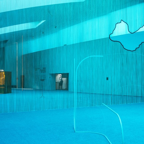 Mangrané's work occupies two floors of the Kiasma Museum. In one of them, a visual reflection is made through a single colour, a blue carpet together with the light that filters through the windows, equipped with the vinyl of this colour, creating a special, almost intangible and changing environment. The gallery installation has different sculptures that complement the experience of the tour.