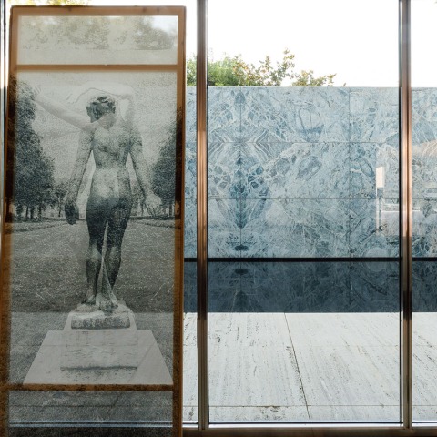 The artist has also created a set of prints on plywood displayed on supports that use the same kind of travertine stone as the Pavilion’s floor. Appearing at first glance as completely black monochromes, these images depend on the movement of the spectator's body (and gaze) to reveal themselves in tenuous contrast. A sound piece installed in the garden completes the intervention, offering a multi-layered account on the work of the architect and his collaborator Lilly Reich.