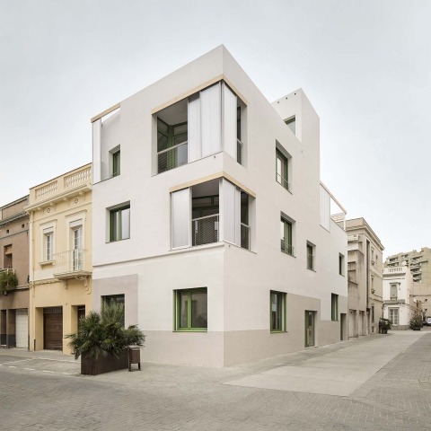 Located in the old town of Badalona, the building is integrated into an environment of houses between party walls, moving away from the appearance of a housing block -repetitive and monotonous - and approaching the randomness and particularity of the houses. The building pretends to be “just another house on the street”.