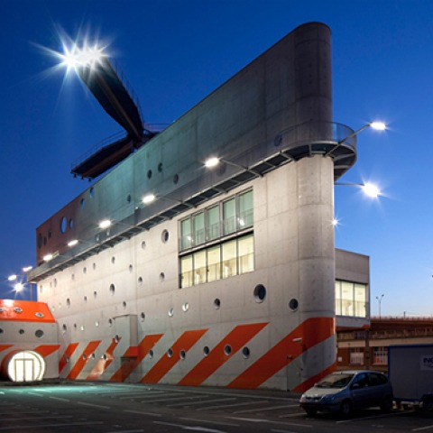 A tripod helix on the top of the unit combines the vertical chimney and light projectors. Covered in solar panels, the component - strong and forceful in its aesthetic - acts as a symbol of the companies engagement in environmental convictions.
