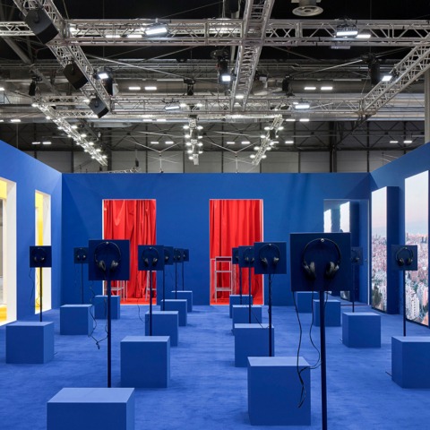 A white wall separates the stand from the fair. The wall is pierced by openings that make up an urban façade and allow a glimpse into the interior. The stand is not open to everyone, but rather invites anyone willing to make the effort to discover what's happening inside.