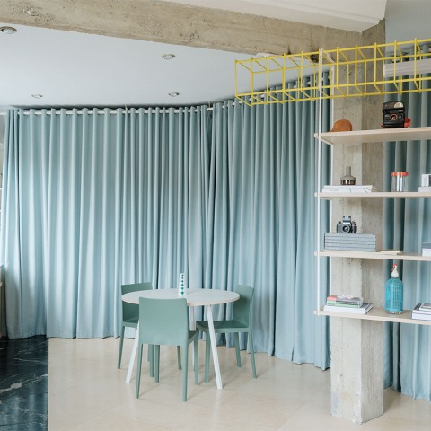 _ The curtain as a continuous element, minimizing the inside-outside that separates closets, pantry and bathrooms introducing theatrical and playful connotations and inviting the inhabitant to perform with it, to change the space and to play with the mysteries, contradictions and paradoxes that privacy offers us beyond morality.