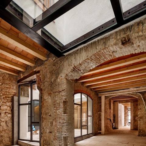 On the ground floor, the visual permeability of the commercial premises between Calle Princesa and Calle Boquer is worked on through the recovery of light from the original patios. The intervention on the ground floor recovers the materials of the original work: masonry walls, stone arches and Montjuic stone pavement that was under the materials placed in the different interventions that the building suffered during its useful life. Likewise, partitions and interior divisions not typical of the original project and that do not constitute load-bearing walls were eliminated. The building manages to considerably increase the luminosity thanks to the recovery of the patios.