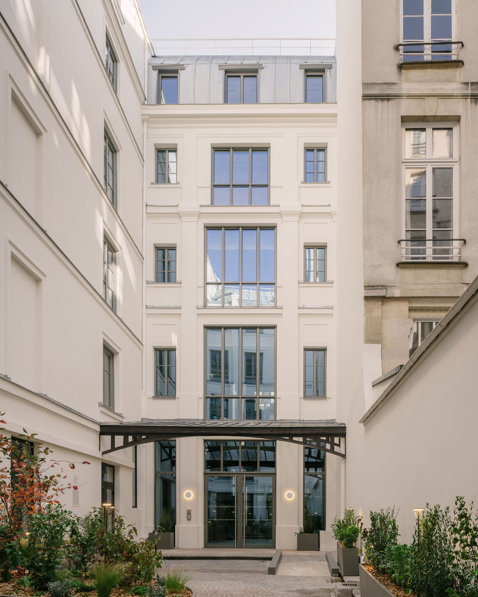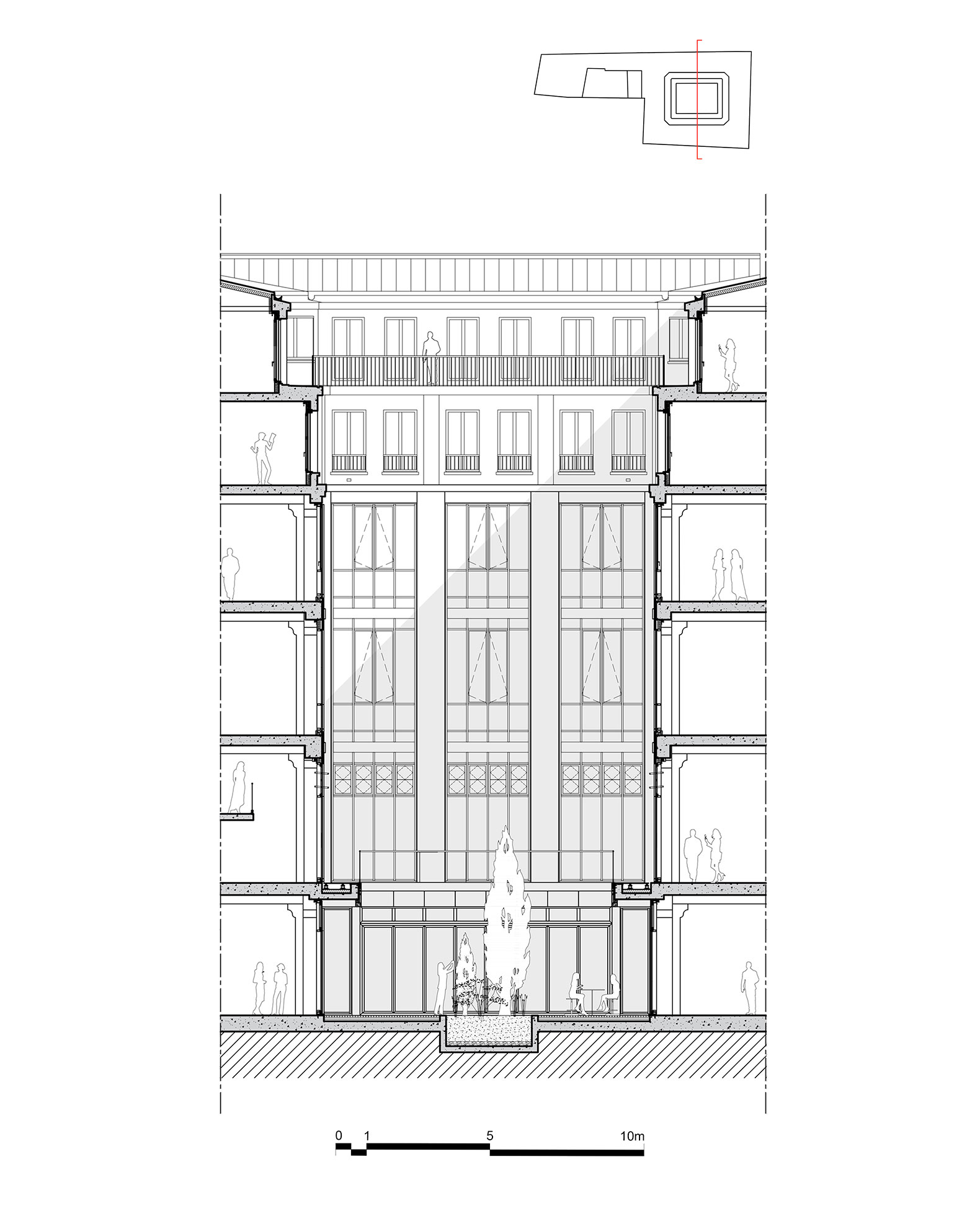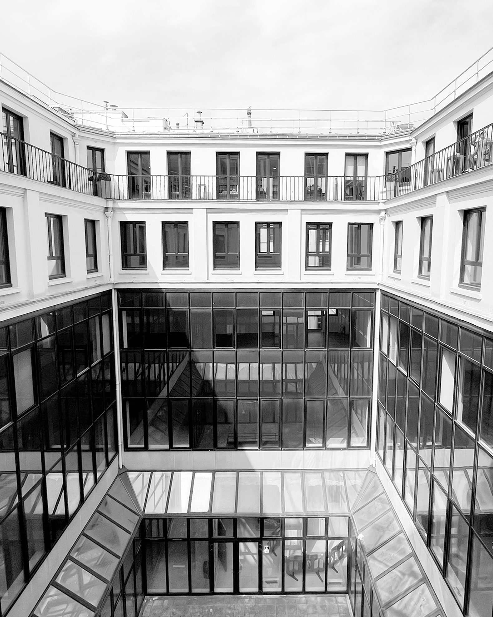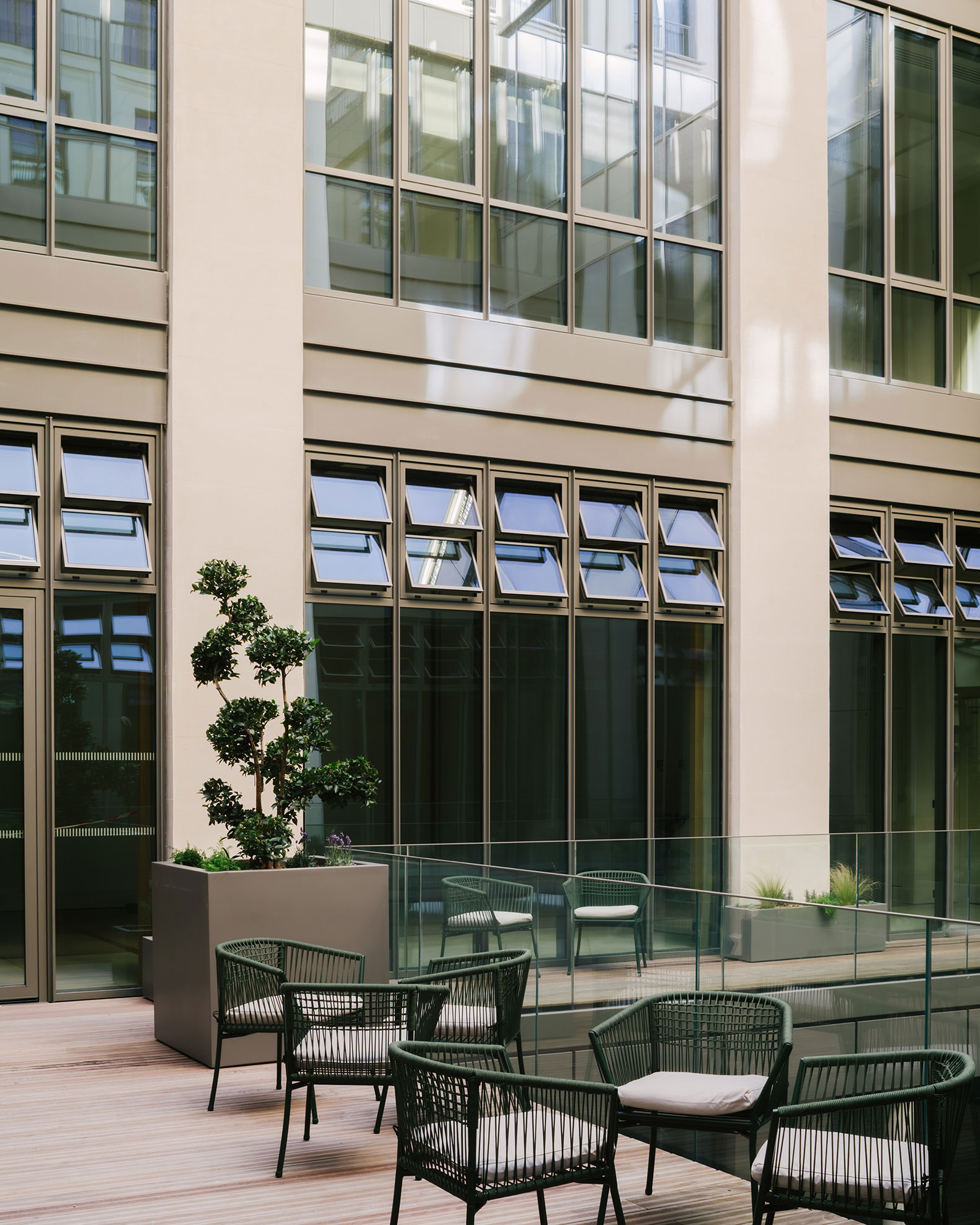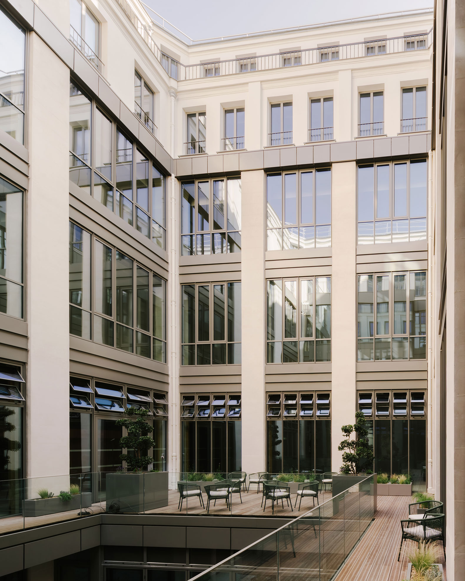 The project is completed with the expansion of the interior courtyard and the transformation of 2,850 m² of offices and common areas into a harmonious work environment. Inspired by the original legacy, the project restores the building's prominence, both in its façades and interior.