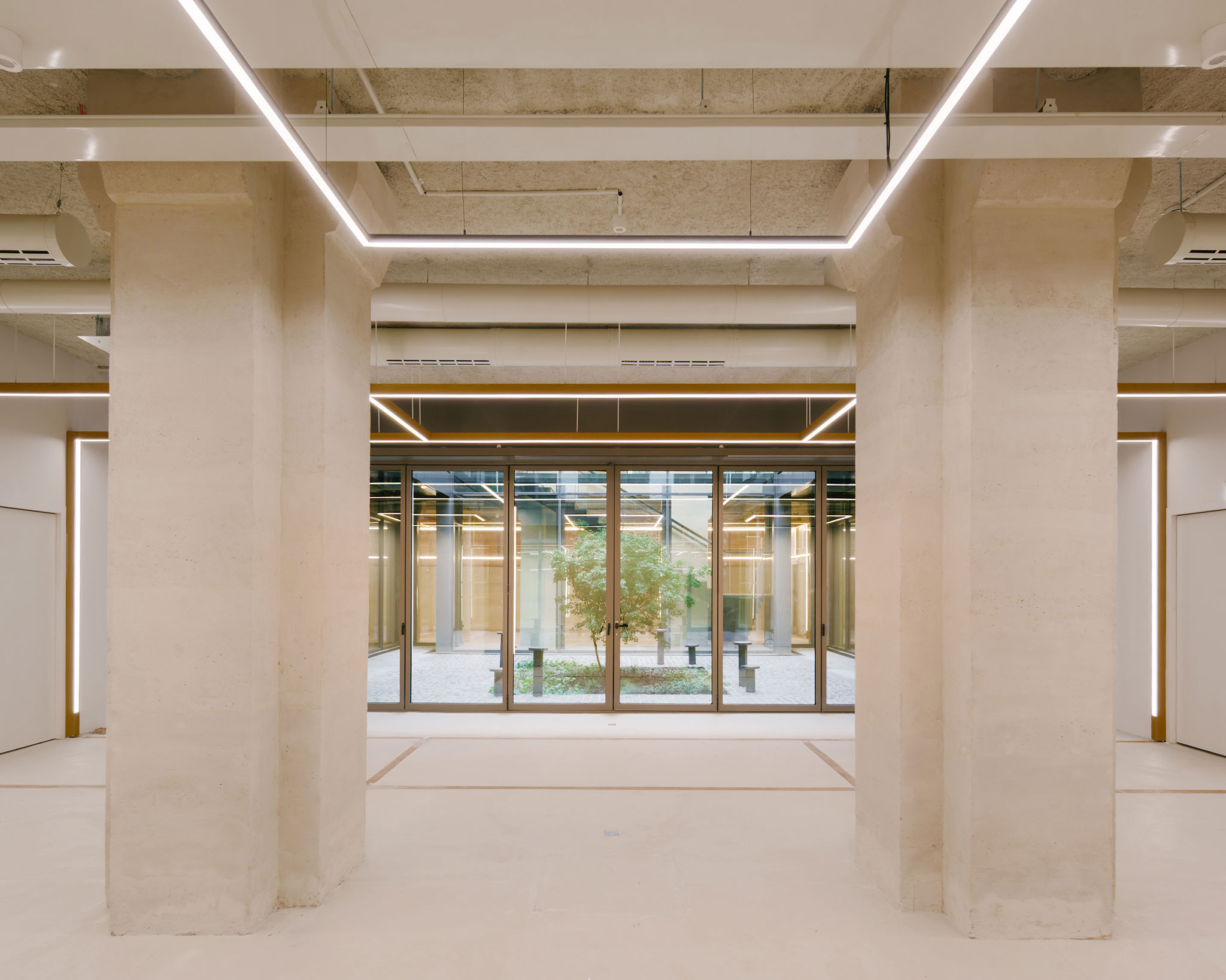 With the façades slated for replacement to meet contemporary standards of energy efficiency and user comfort, the project sought to recall the building’s industrial past. This work revealed and restored the massive stone pillars, once hidden behind the 1980s façade, while the geometry of the new window frames and the selection of specific openings subtly echoed the rhythm and character of the original workshops. The project also reimagined the inner courtyard, enlarging the patio at basement level (SS1), and transformed 2,850 m2 of office and communal spaces into a harmonious work environment.