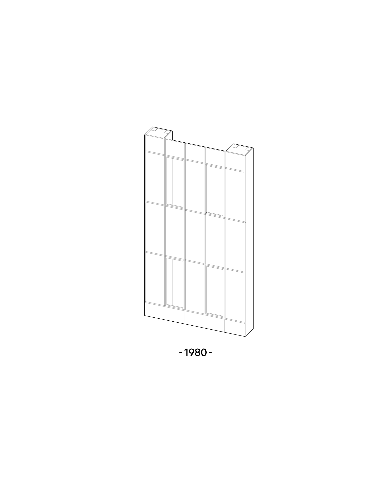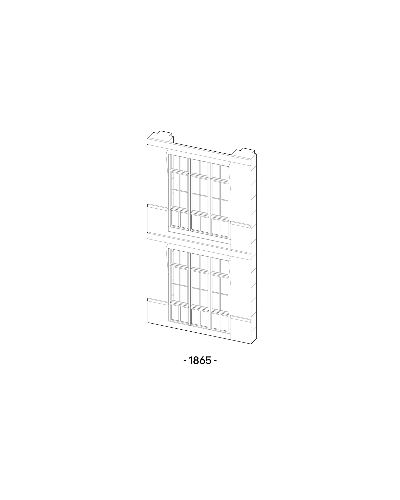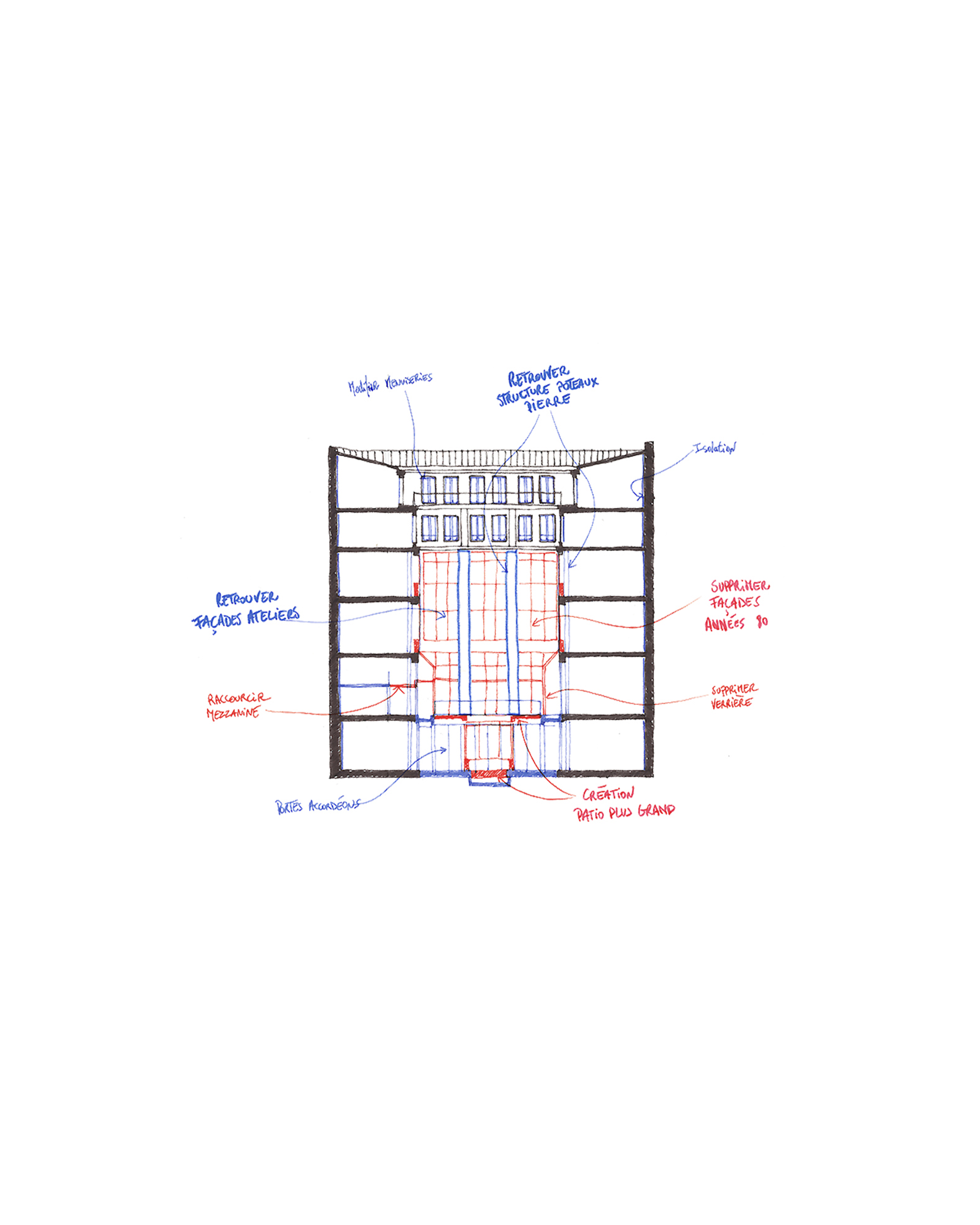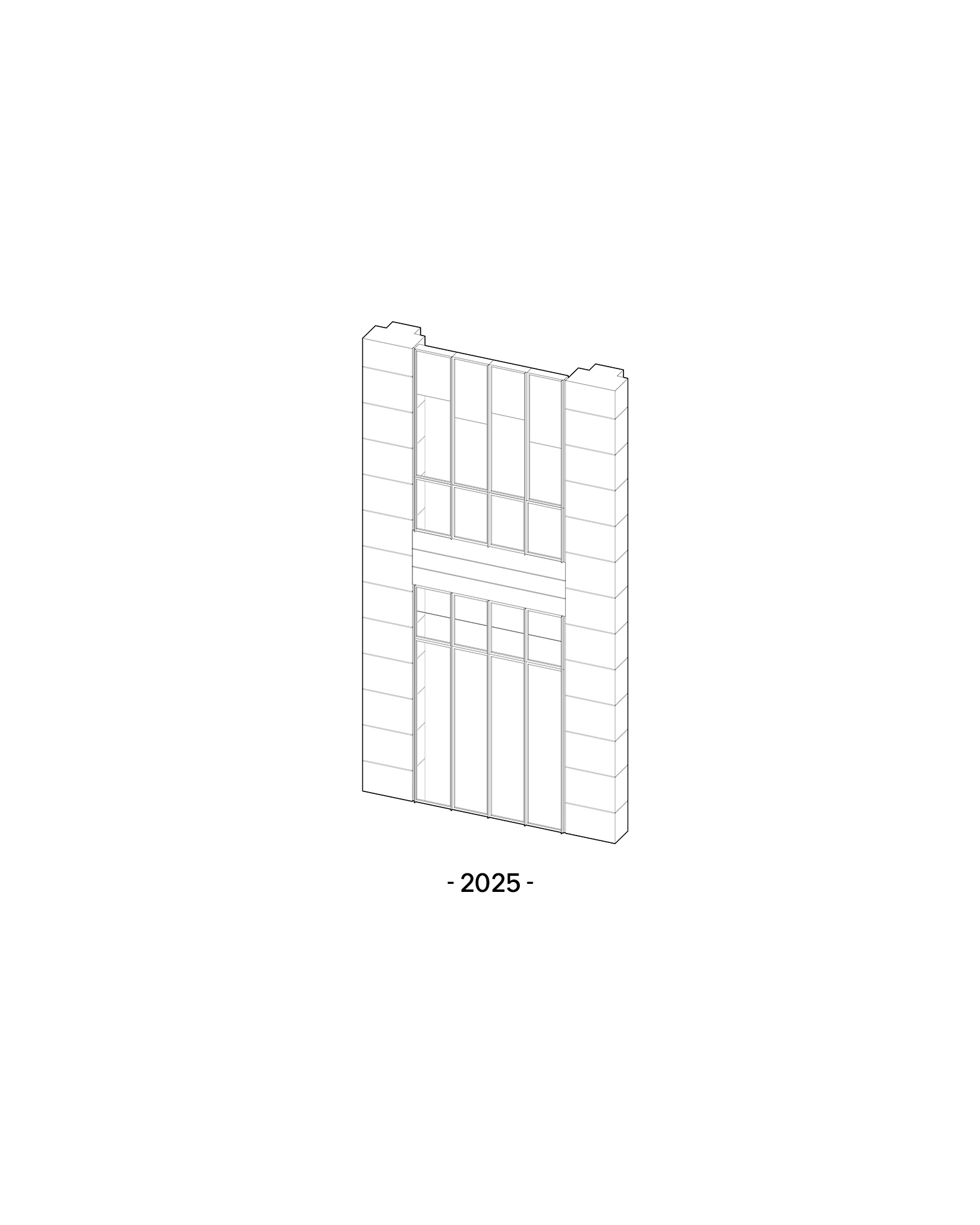 Built in the mid-19th century, this building originally housed textile workshops. In the 1980s, it underwent its first transformation into offices, an intervention that partly obscured its industrial heritage. Large smoked-glass curtain walls replaced the original workshop windows and concealed the stone pillars that had long articulated its façades. Reimagining this earlier transformation—perceived as a loss of the site’s memory—became the starting point for our project, aiming to restructure and revive the entire building.