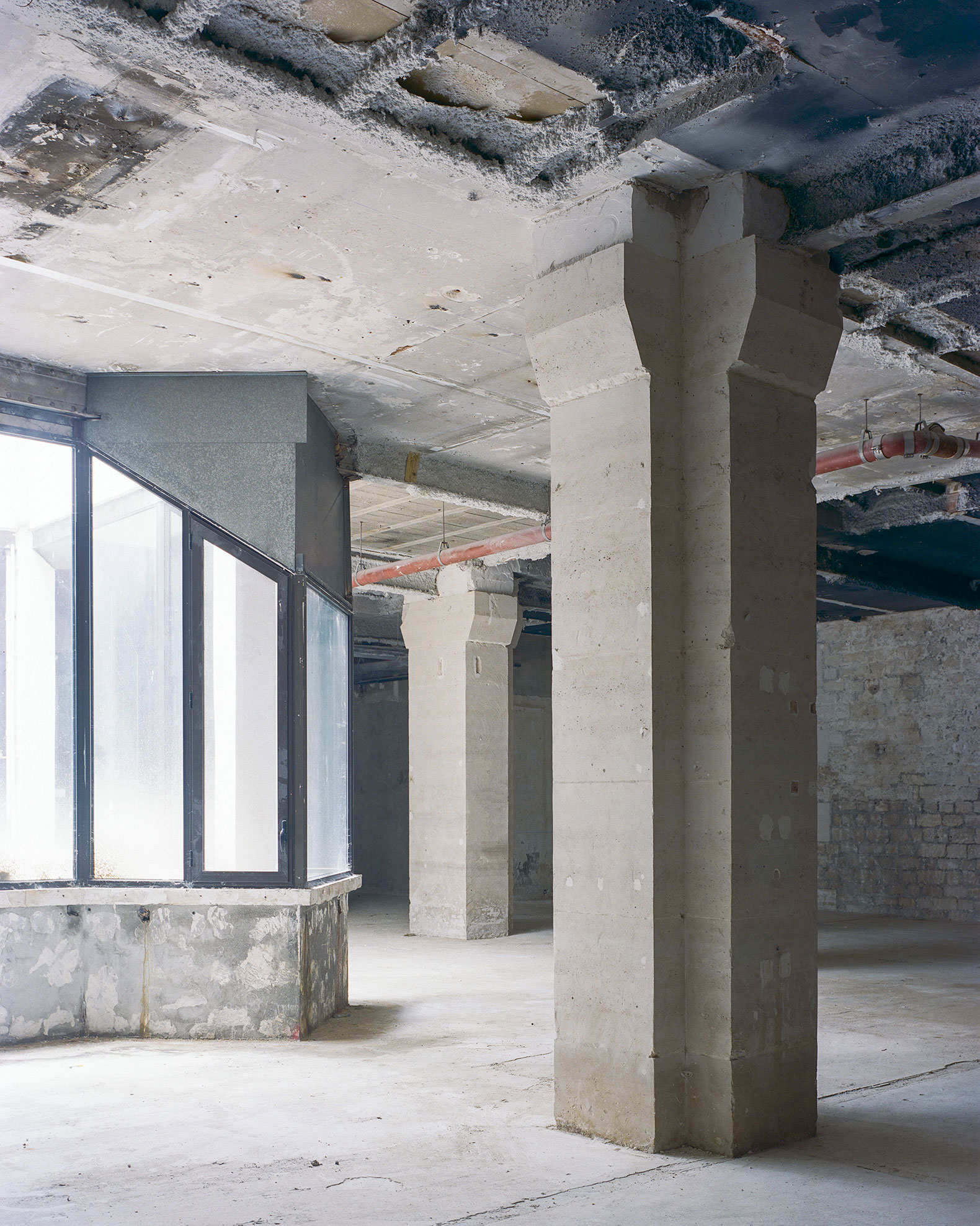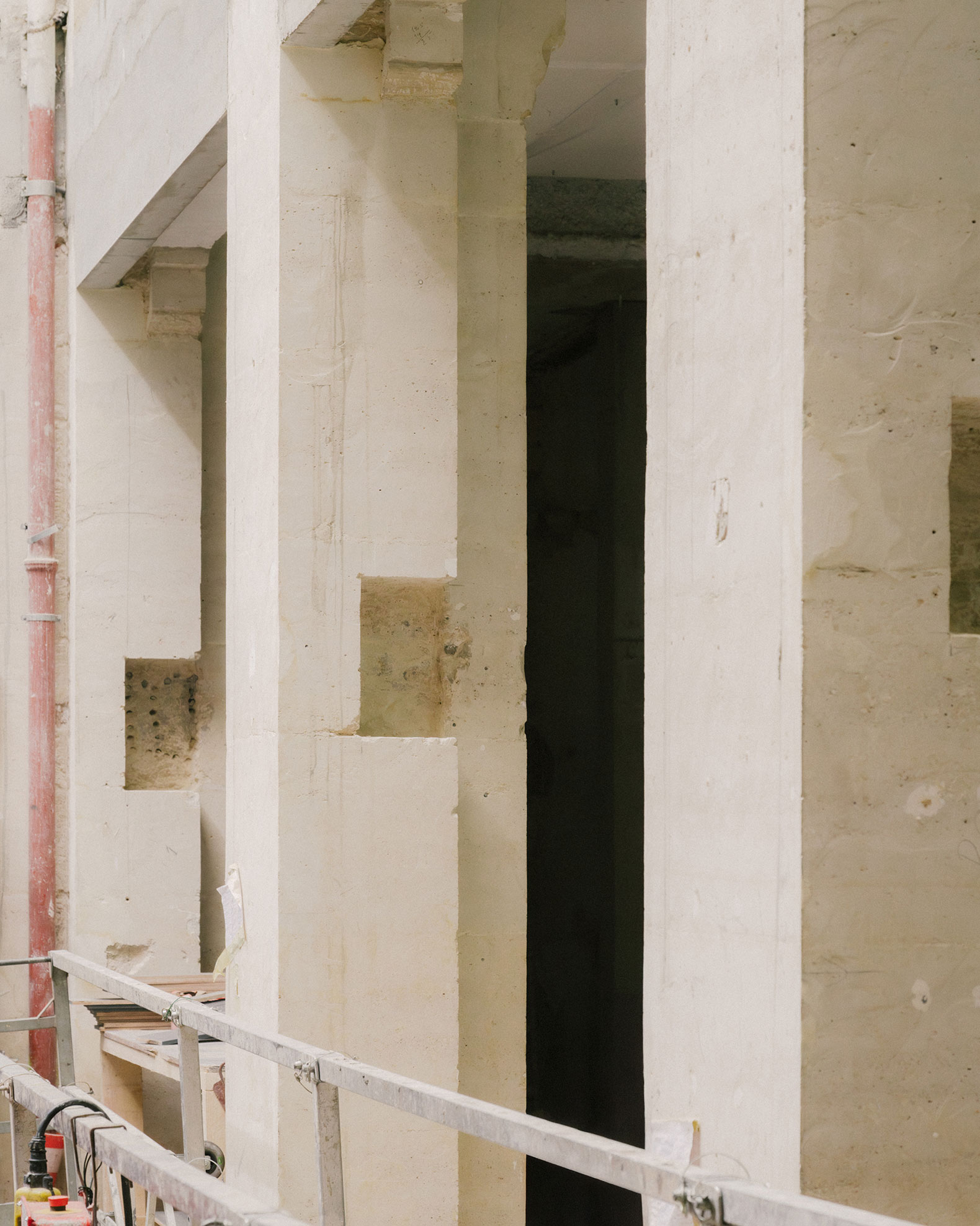 The smoked-glass curtain walls added in the 1980s hid the stone pillars that once gave the façades of these former workshops their character. Inside, these pillars had also been coated with plaster and render.