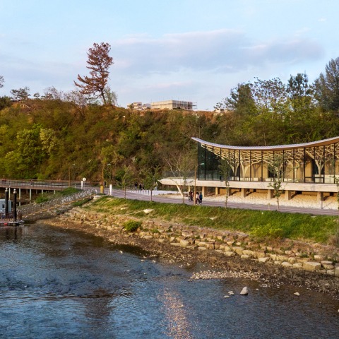 JK-AR recreates the idea of the forest in the interior structure of a "ru" pavilion, where the columns simulate trees like a path in the forest. The elevated pavilion invites visitors to enjoy a connection between the natural and the urban environment.