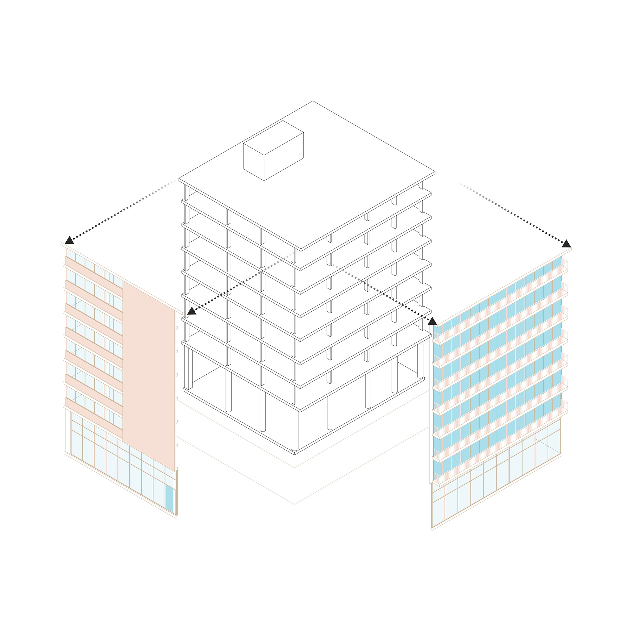 The goal was not just to renovate the building, but also to expand its potential. While preserving its columns, vertical core, and service ducts, the interior layout, façades, and material palette were completely redefined. This approach reduced the environmental impact significantly compared to new construction while preserving an important chapter of the site’s architectural history.