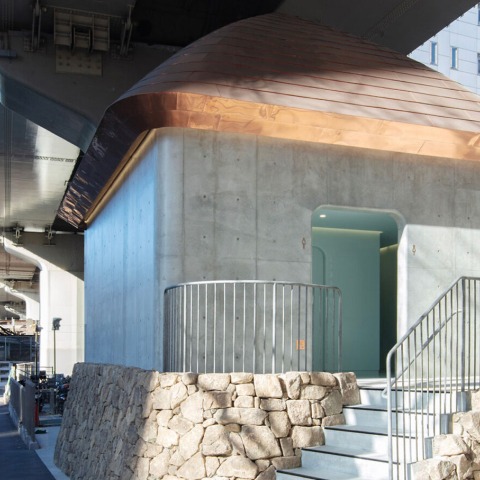 His design recalls vernacular Japanese architecture and craft, such as the stone wall and the copper Minoko roof which is often found in shrines, temples and tearooms in rural areas. The main body of the structure is concrete: a material used in a more noble and refined way in Japan than in other countries. The aging of these concrete walls, along with the patina of the copper roof, will integrate the structure with its environment over time as it becomes an established public utility.