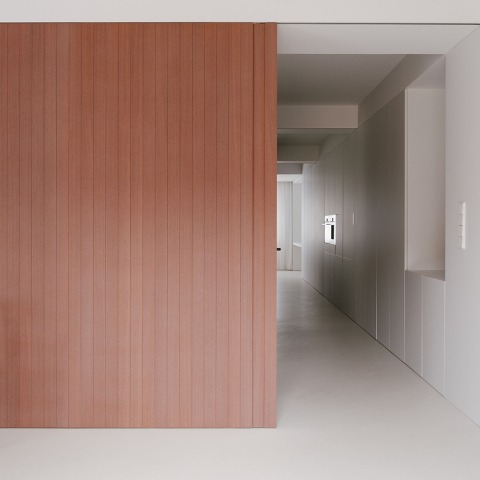 The space between the two, the wooden box and the white surface, is a flexible and spacious distributor that can be divided by sliding doors that protrude from the wooden box to configure dressing rooms, storage or to extend the kitchen, and that runs through the house from north to south, from the living room to the bedrooms, crossing the rooms as if it were a palace.
