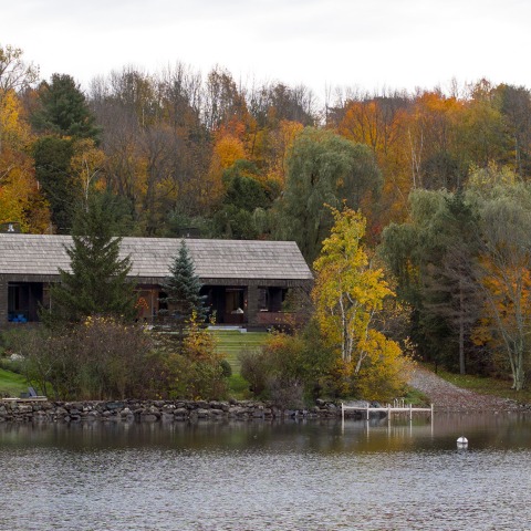 Sitting on the west banks of Lake Memphremagog, the Lakeside Gallery Residence is a contemporary reinterpretation of the traditional barn volume typical to rural Québec. The design repeats the prototypical form in four different articulations—an outdoor summer home, an indoor winter home, a living quarter, and a guest quarter. Cedar roofs, brick walls, and glass bridges tie the four volumes into one singular experience.