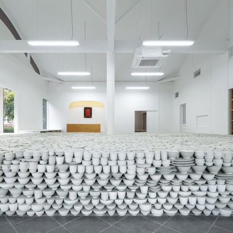 Constructed of 25,000 pieces and in cooperation with numerous pottery factories from Hasami area, the conceptual and experiential focus of the design is a stacked central platform, layers of locally sourced imperfect tableware and poured concrete. Each of these pieces called “Shinikiji” in Japanese, were found to be flawed after the initial bisque-firing by their respective local production facilities. As part of his re-valuative design process, Seki revived these pieces, using them to make bricks, and transforming them to a new architectural material for this occasion. Collected here, the stage is not only a representation of “Monohara”, the name given to the kiln-side specific areas where dispose its broken pieces on firing process, existing solely in Nagasaki, which have accrued these imperfect pieces for approximately 400 years—an archaeological mille-fille of the long industrial history of this region—but also creates a sense of reverence for this history, conveying the fragilely of the each individual item, engineered together to inspire and cultivate respect for the legacy on the whole.