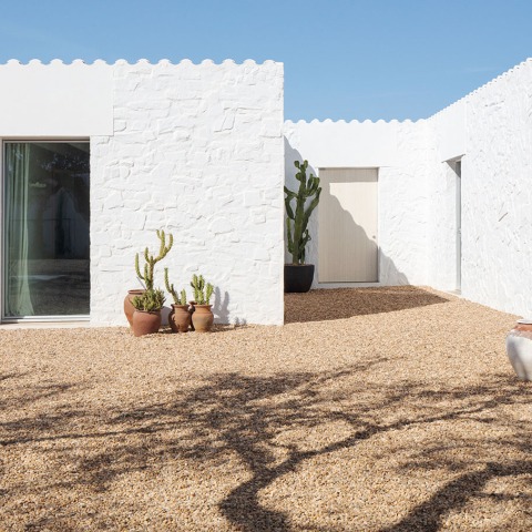 The house is located in the Southwest of Alentejo, deep in the Grandola hills. The gently undulating topography contrasts with the harsh dryness of the landscape and its bare vegetation of cork and holm oaks with sparse bushes creeping from the calcareous soil.