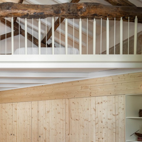 Inside the building we find original elements such as granite stone walls, covered with stucco, wooden beams, shutters, doors, stairs and skylights, which have been carefully treated and restored. Despite the variety of materials, the combination of tones and textures reinforces the dialogue between old and new.