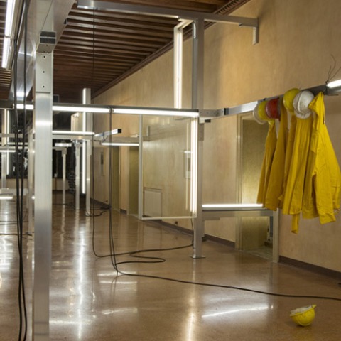 “A remote whisper” flows through the rooms, embracing the walls, doorways and floors with aluminium tubes, florescent lights and cables which are drawings in space. It is a semi-precarious, hand-made, almost architectural construction which integrates fragments coming from his studio like parts of earlier works abandoned by him, documentary material, photos as well as drawings and paintings next to flotsam and jetsam found in the city.