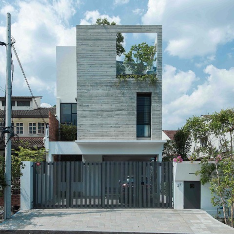 The building is extended along its southerly front facade with a board-marked concrete wall that sits over the car porch. This new façade wraps around the master bedroom and extends upwards to enclose a roof terrace on the top floor. Here, the concrete wall is punched with large rectangular openings that frame views out to the neighbourhood and the city’s skyline. Some privacy and shading from the afternoon sun in the terrace are provided by multiple trees planted in oversized planters brought up and put in place by a crane during construction.