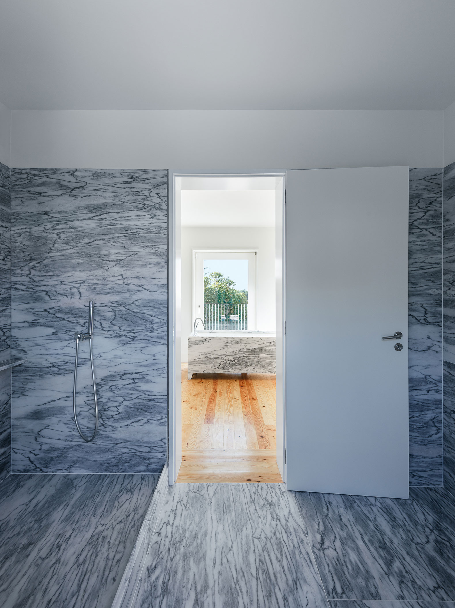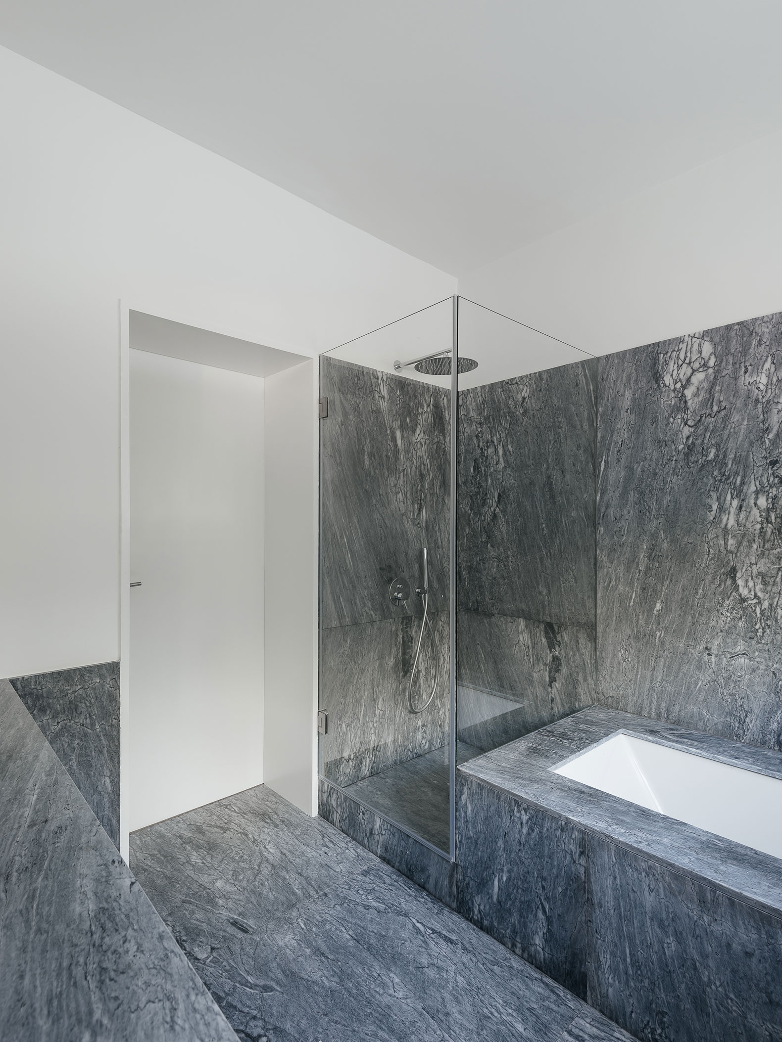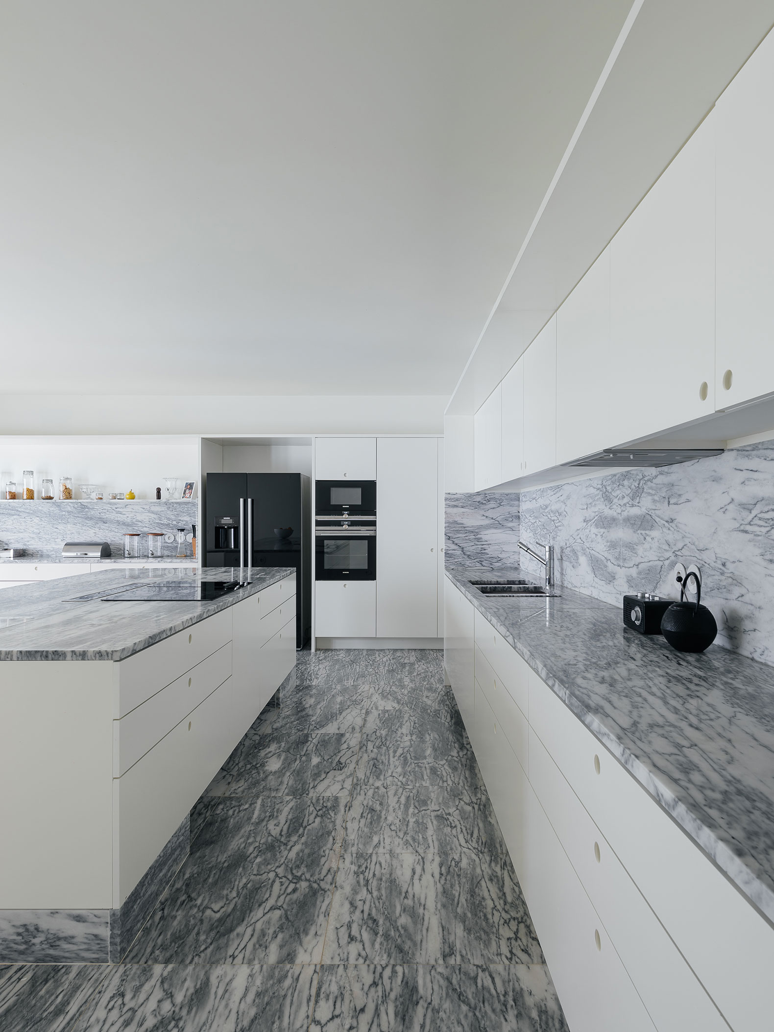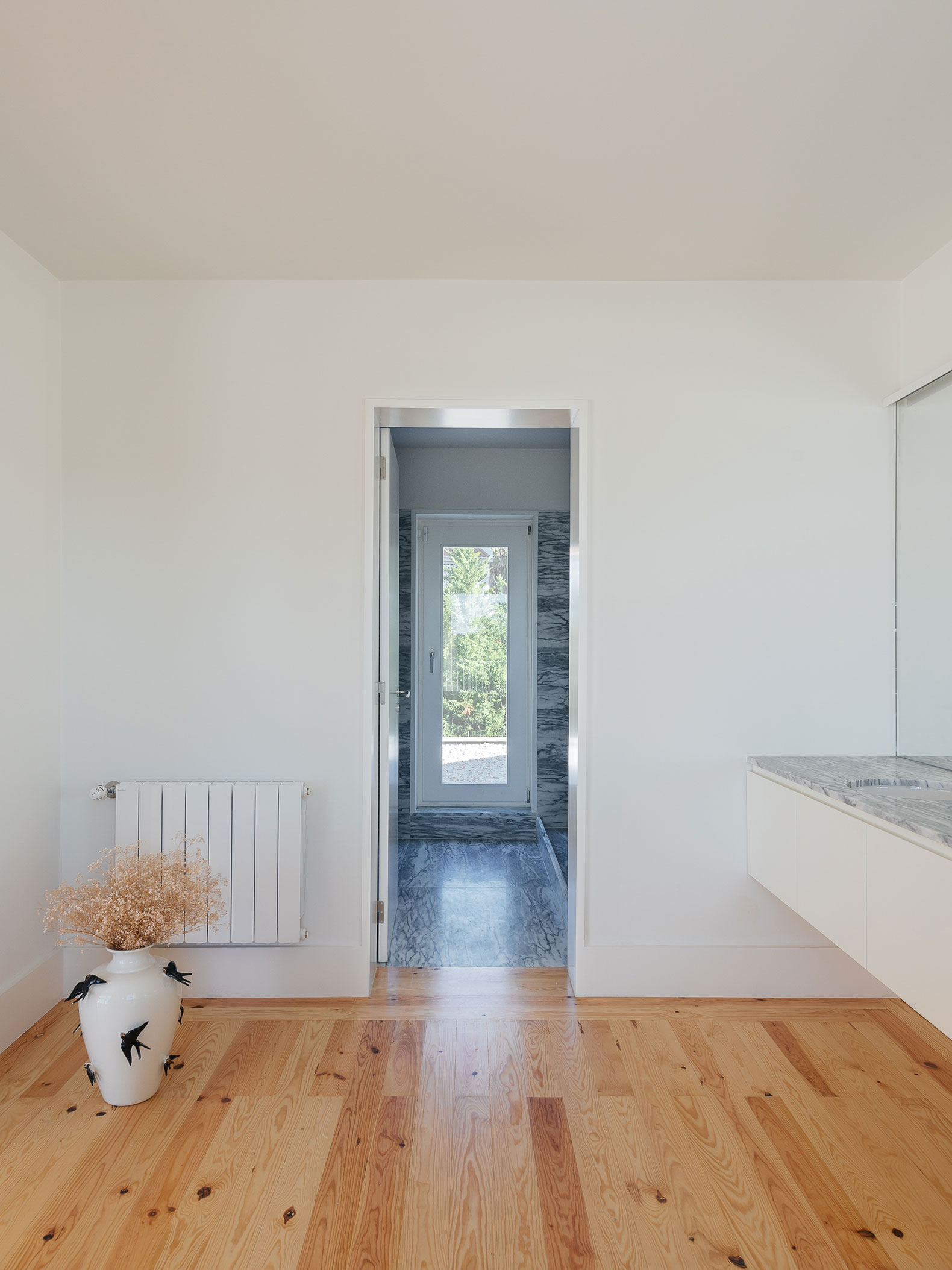 In the alignments of the new flat floor covering, the highly rational elevations and apparent symmetry find a reflection of a formal syntax that cuts across the entire house. The internal spaces are clearly joined and obey a consistent geometry and a firm functional hierarchy. The materials are perennial and receive natural light, creating a dialogue with a succinct vocabulary of textures. And the sequence of neutral, sober spaces exposed to the emptiness of the interiors creates a form of silence, in which all elements serenely occupy their places.