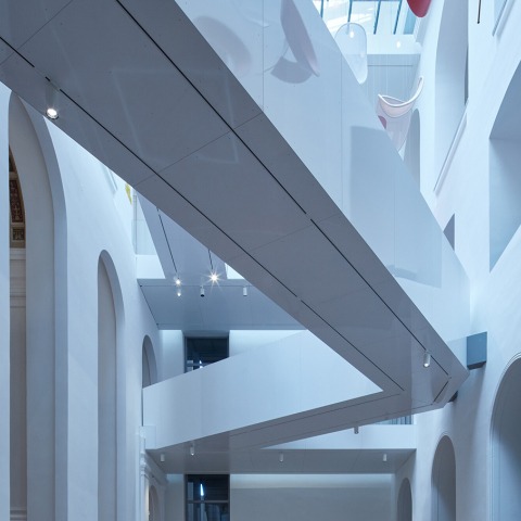 An inviting and airy tour experience is achieved, with new walkways connecting its floors, designed by the Olgoj Chorchoj architectural and design studio. The walkways utilize previously unused vertical spaces under skylights, creating ideal locations for site-specific installations.