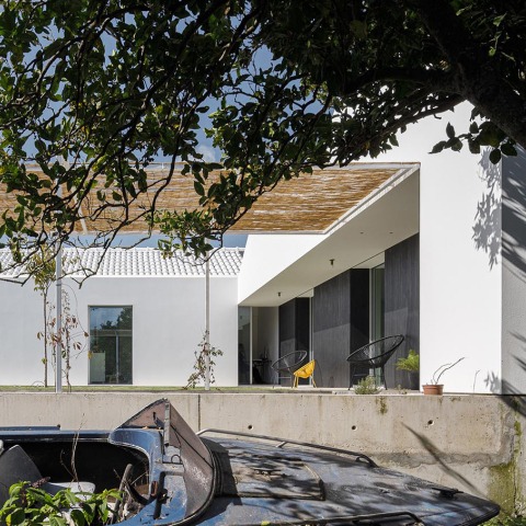 The option to “close” the house to the street creates a sense of privacy and isolation. In our view, this should be one of the purposes and concepts of inhabit… to create a refuge where we feel good. Thus, the house is facing to the street only the main entrance area and the car access. The remaining program, of an intimate nature, turns to the interior of the terrain. The general program is divided by its function. The social area is closer to the street and comprises the entrance hall, toilets, laundry, kitchen, common room, and access to the garage.