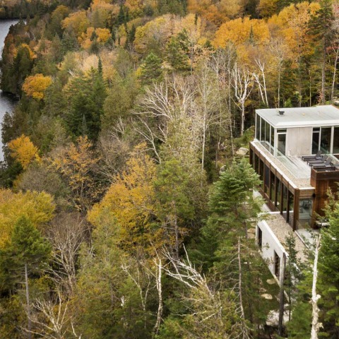 This light-filled house, an hour and a half from Montreal, is literally hanging from a cliff as its name, "Dans l’Escarpement", implies in French. It is located on land pertaining to an estate started over a hundred years ago and known for its remarkable landscapes and pristine lakes.