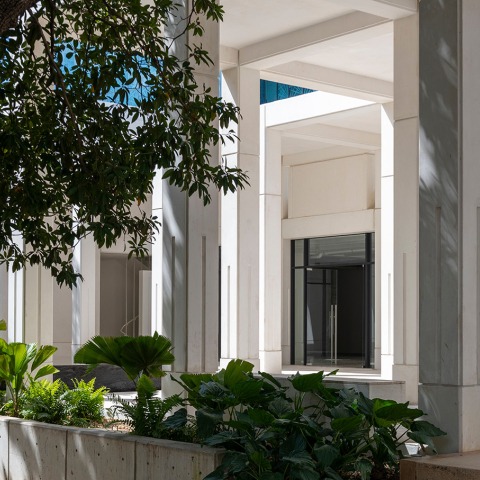The project is set behind a line of existing old trees, supporting the aim of not being an object, but rather a series of spaces intertwined by portals and thresholds. The columns and porticoes frame views of the gardens, pavilion, and house, creating a central courtyard that envelops a public space. The architectural language is composed and expressed by the structure, communicating its tectonic assembly and creating surfaces to receive light and the projection of shadows in an ever-changing natural environment. All prefab concrete was made locally in collaboration with regional aggregates. The stone is also native to the area. The work of reveals, joinery, and detail in the concrete acts as a reinterpretation of the ornament of the house, while attesting to its mounting and fabrication method.