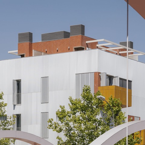 The complex is a small community of eight apartments in a quiet residential area of Madrid, configured as duplexes stacked on two levels, all of them with two corner orientations. The four lower apartments enjoy a private garden at ground level while each of the upper apartments enjoys an equally private roof garden. In addition, all homes share a garden with children's play area, a swimming pool with solarium and a communal garage that includes motorcycle spaces and storage rooms.