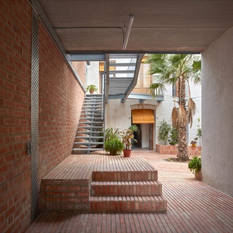 The key to the project of David Estal and Arturo Sanz, in accordance with the new vision of the owners, resides in the attention paid to common space: four houses coexist on the plot of 7.5 x 26 m, where a large brick central courtyard has been built around a Washingtonian palm tree, reminiscent of the historic palm trees of the street la Barraca.