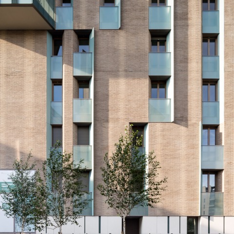 The access to the private underground car park is located within the building volume; the base of both bodies is marked by large slabs of rusticated white stone divided by metallic elements, creating a formal continuity at eye level along the existing street. Over this, the strong horizontal lines of the glass parapets is balanced by the verticality of the metallic elements and by the windows stacked up in tall vertical figures which bind together the various floors. The variety of colors and surface textures of the materials - handmade bricks in two different shades of clay-color, frosted glass, corrugated and perforated aluminum sheets enameled in a gray-turquoise metallic hue - generates a continuous variation of the urban fronts from different points of view within a strongly unified design, which keeps together the different sizes of the openings.